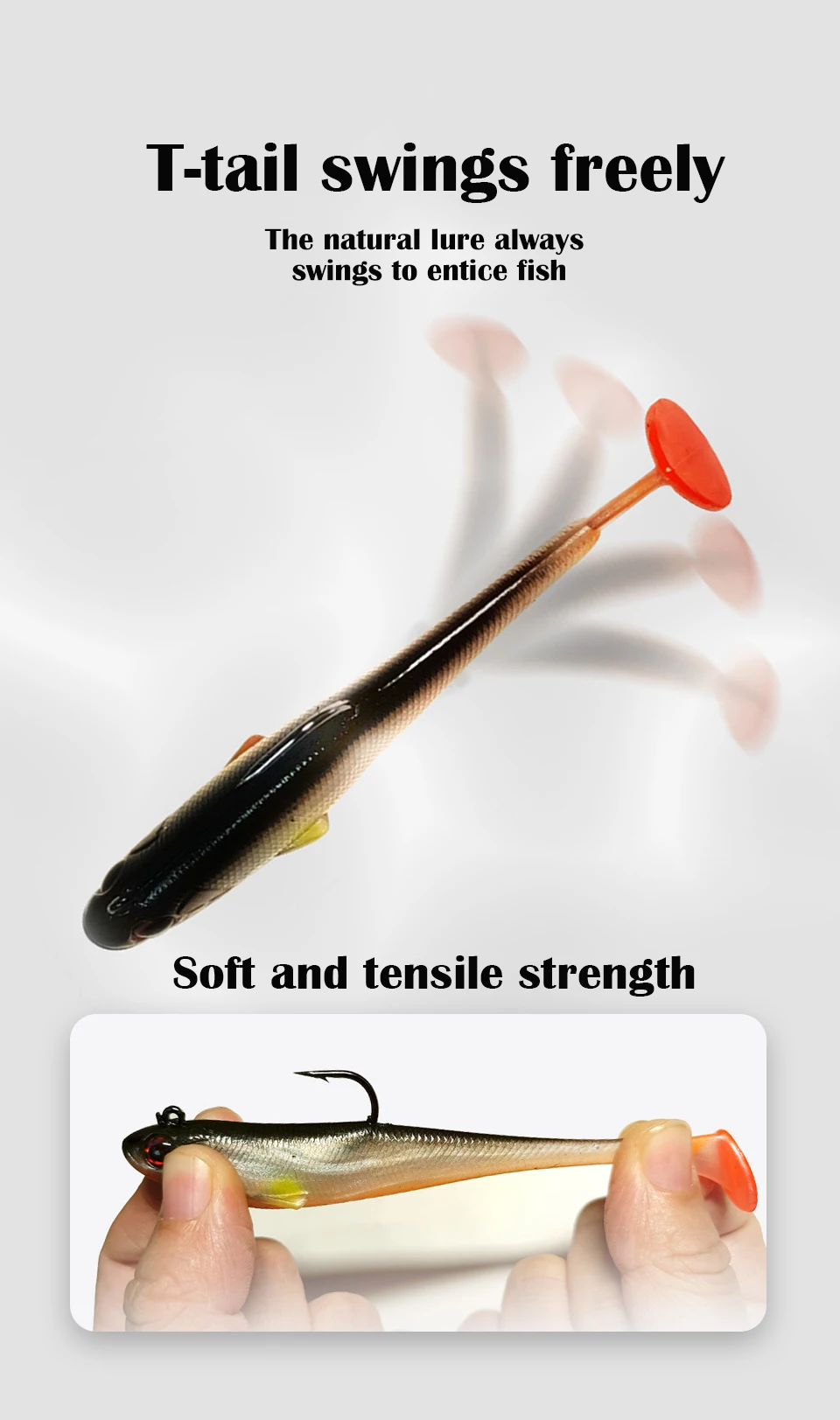 Con un diseño único de cola en T, este cebo para pececillos imita la acción de natación natural de los peces reales, atrayendo eficazmente las especies objetivo y aumentando su tasa de captura.