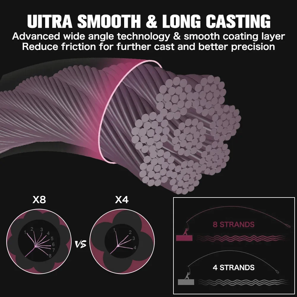 HORAS 8X: nuestra trenza 8X tiene 8 fibras de PE de tejido apretado para una línea más delgada, suave y ultraperformante.Tener 8 hilos le da a esta línea una sensación mucho más redonda y natural, lo que da como resultado lanzamientos más lejanos y una experiencia más suave en todo momento.