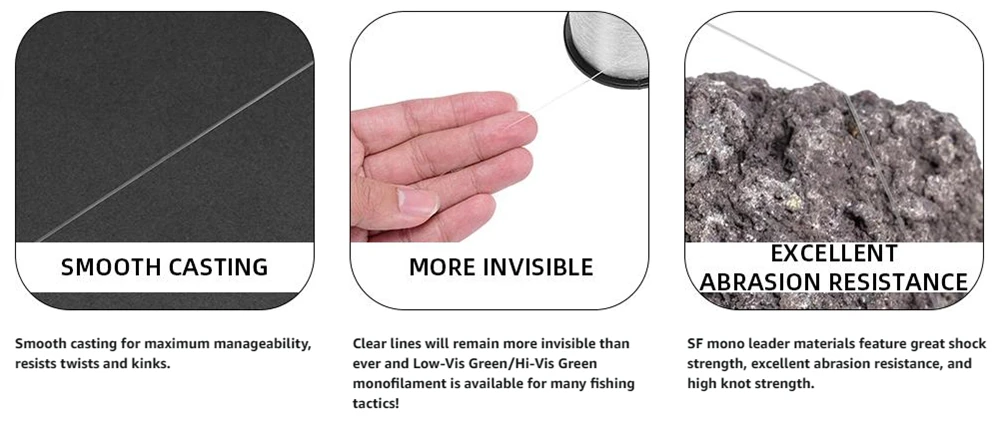 1.MATERIAL: El nailon y el fluorocarbono únicos, el sedal hecho con tecnología de seguimiento de rollo en paralelo, la combinación de los dos materiales hacen que el sedal sea extremadamente duradero, de alta resistencia y menos elástico.