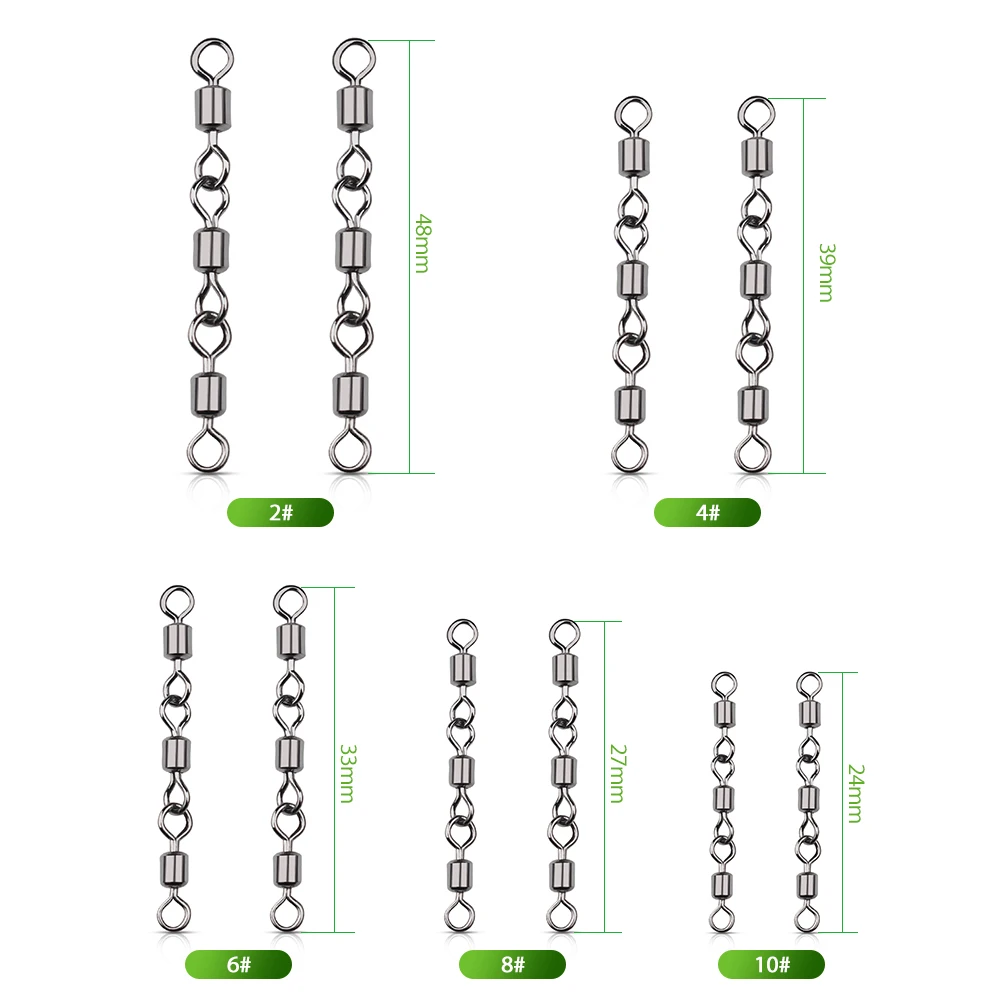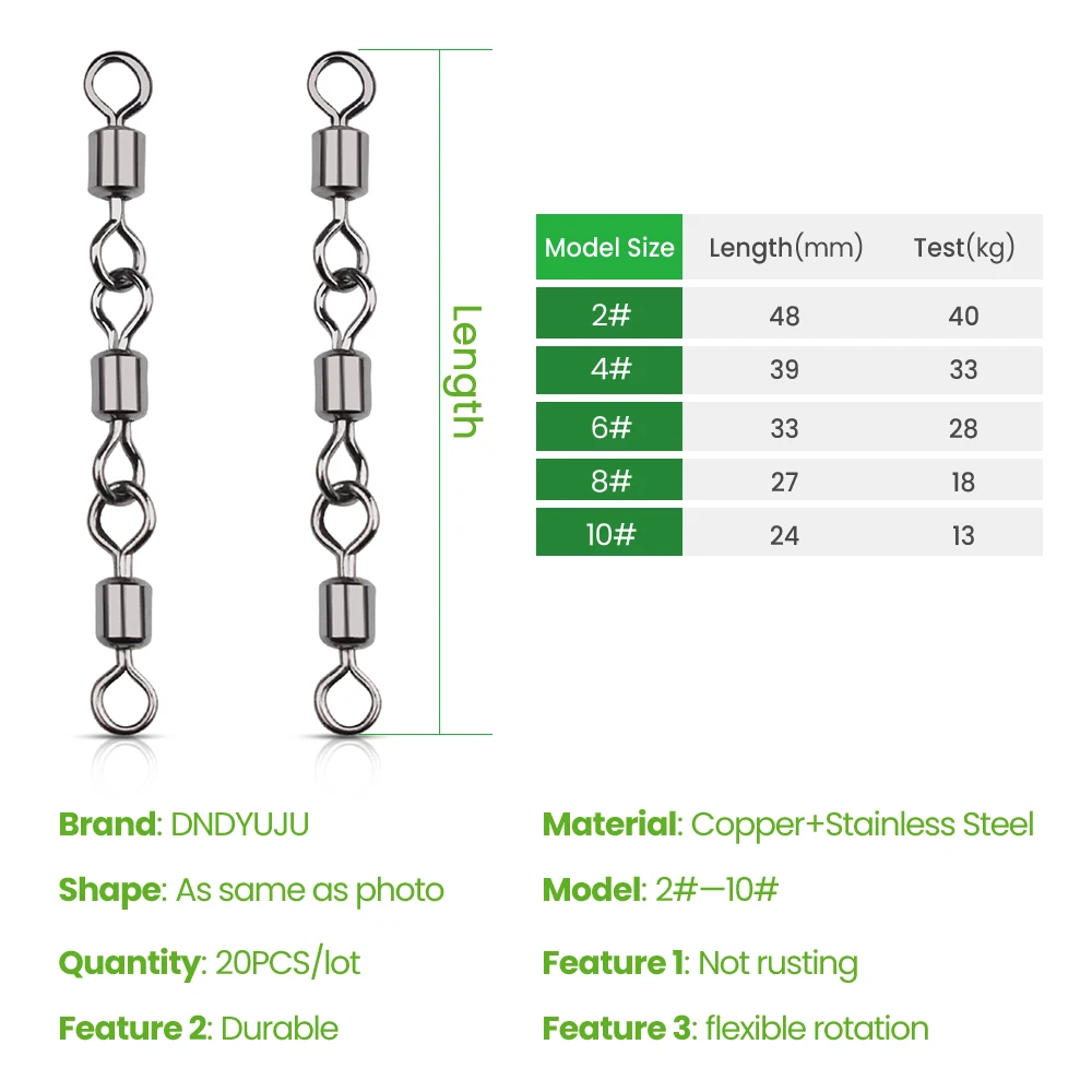 TIANNSII, 10/20/30 Uds., Conector de pesca de tres articulaciones, anzuelo de pesca giratorio, Conector de anillos sólidos, accesorios para aparejos de pescaPrueba de tamaño y longitud