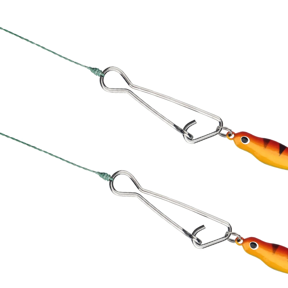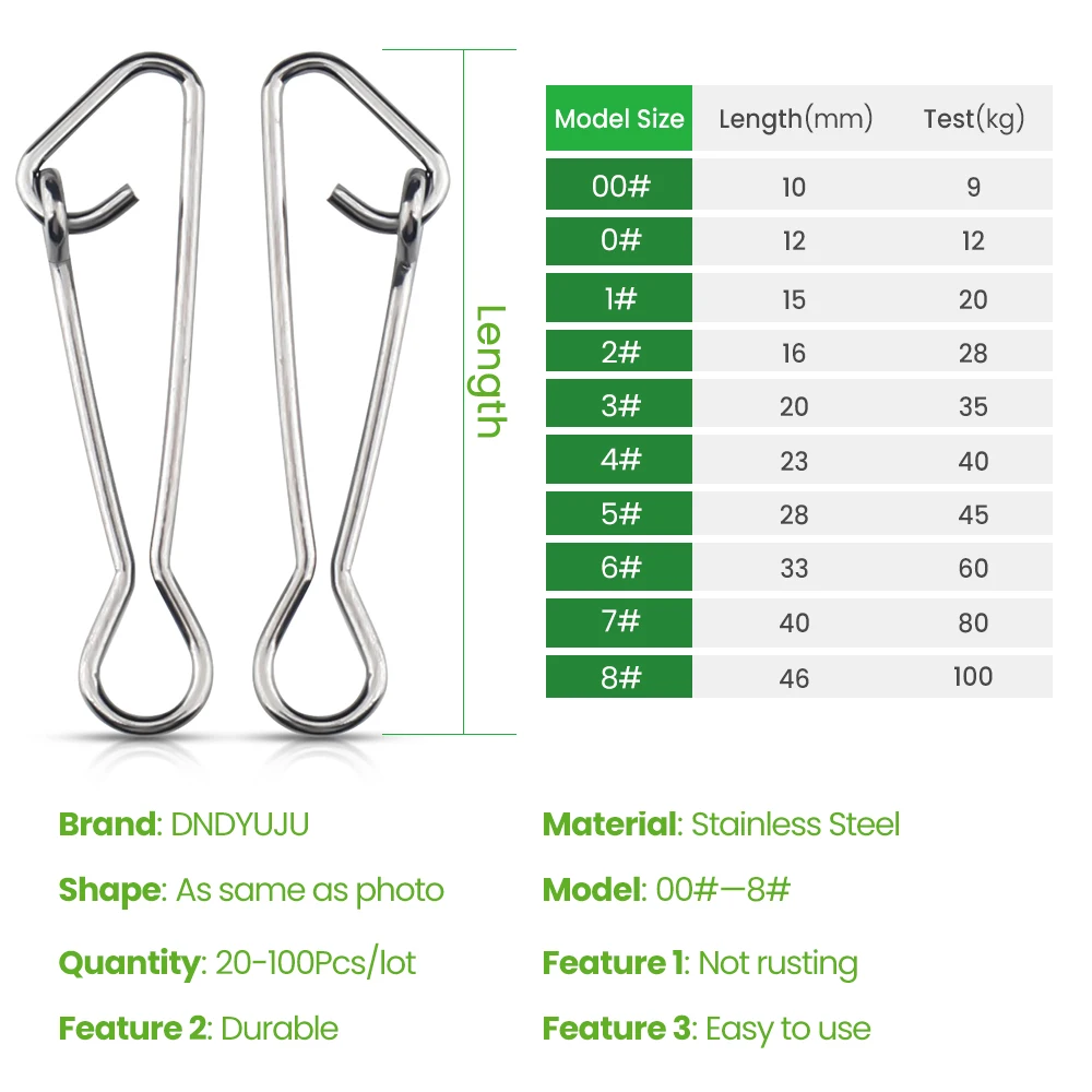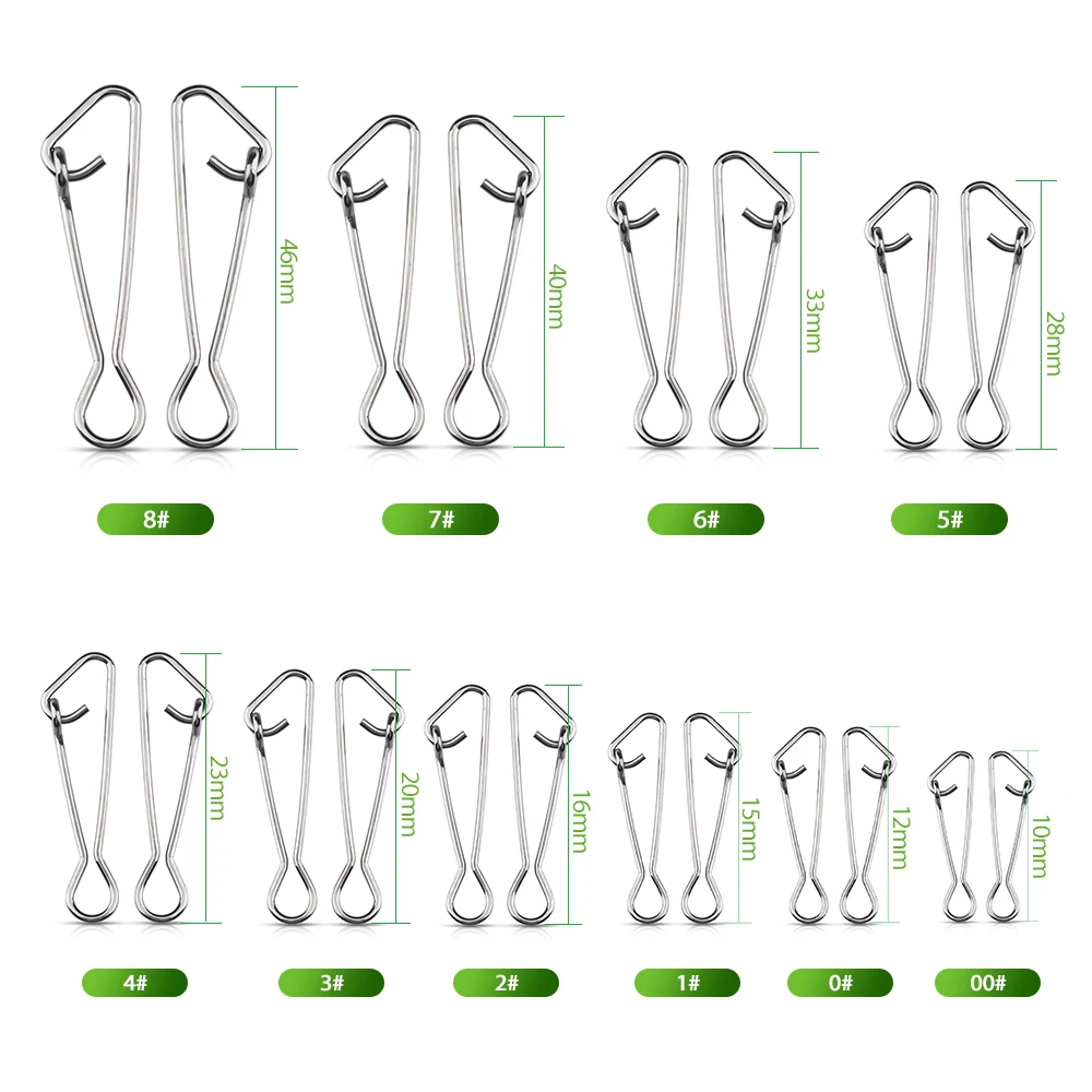 TIANNSII 100 unids/lote, Conector de pesca a presión, gancho de pesca de acero inoxidable, gancho de pesca giratorio para el Océano marinoCaja de prueba de longitud de tamaño