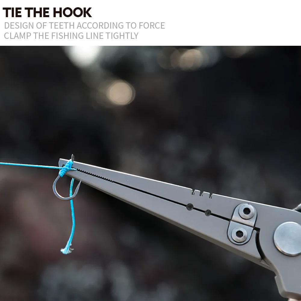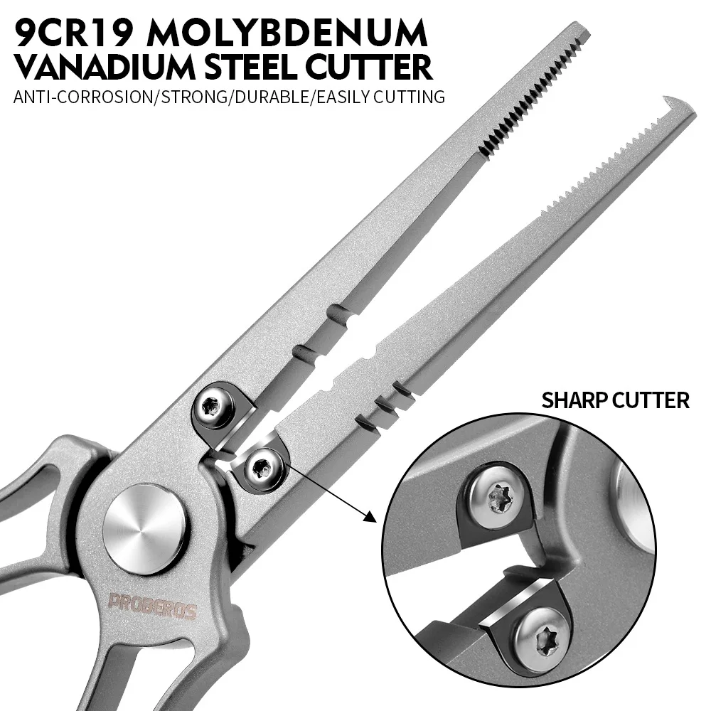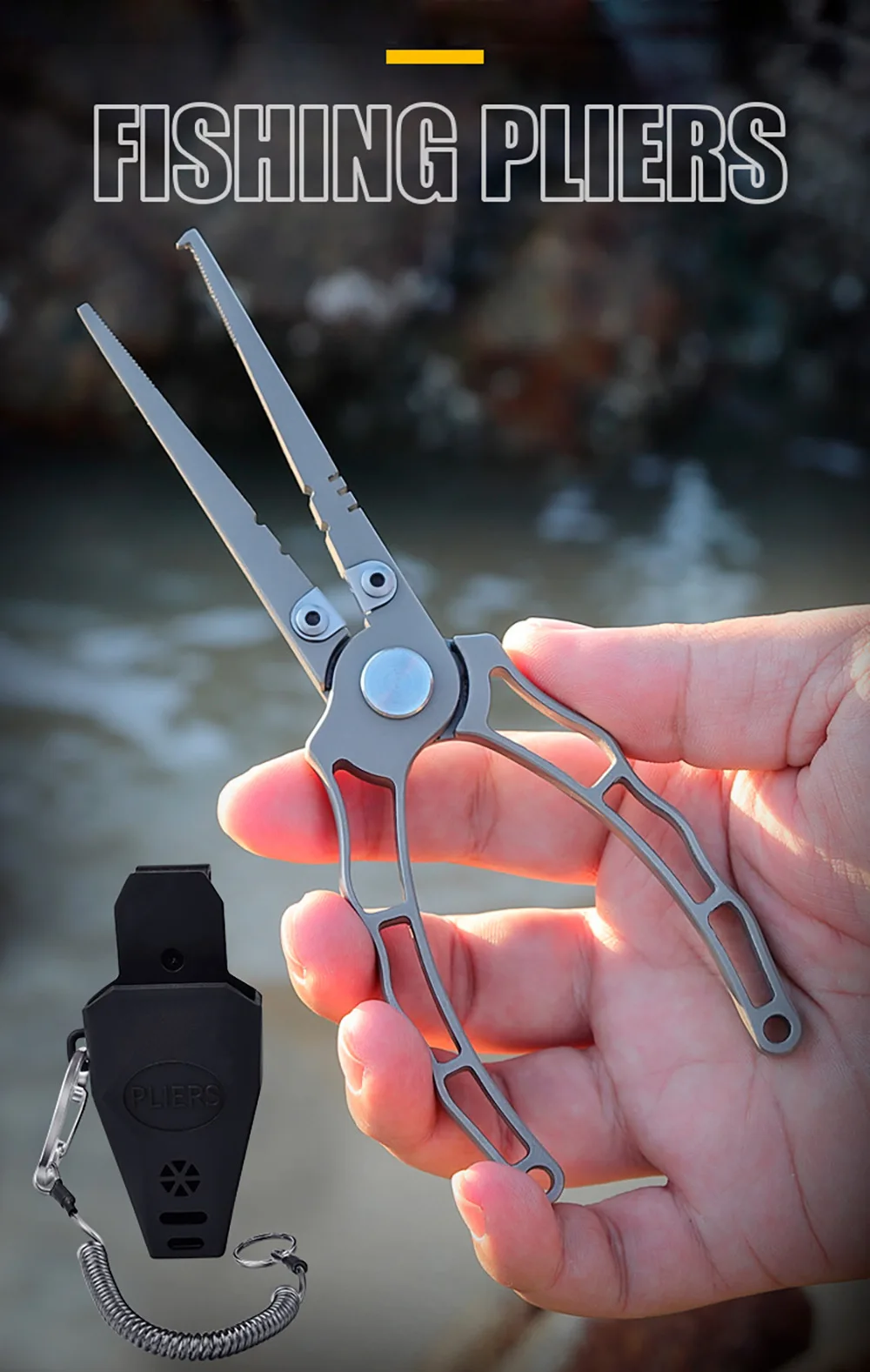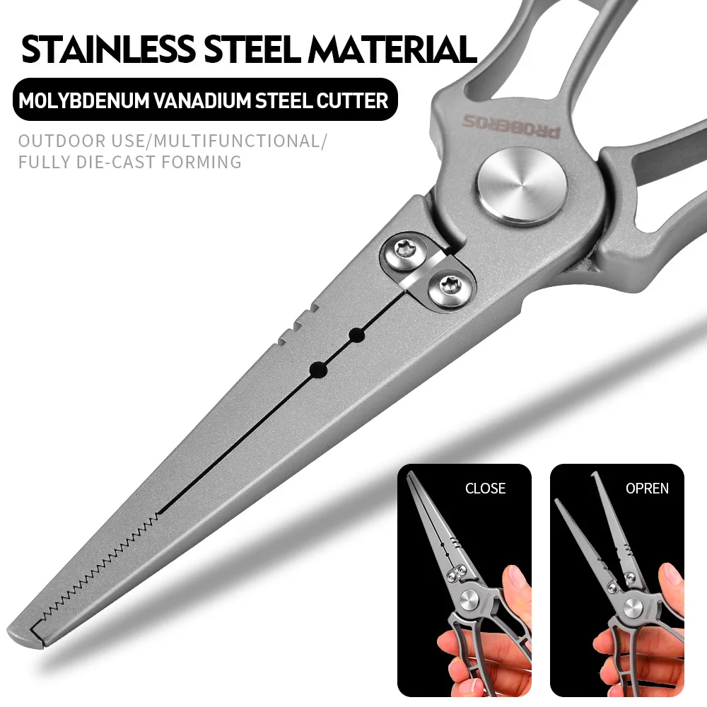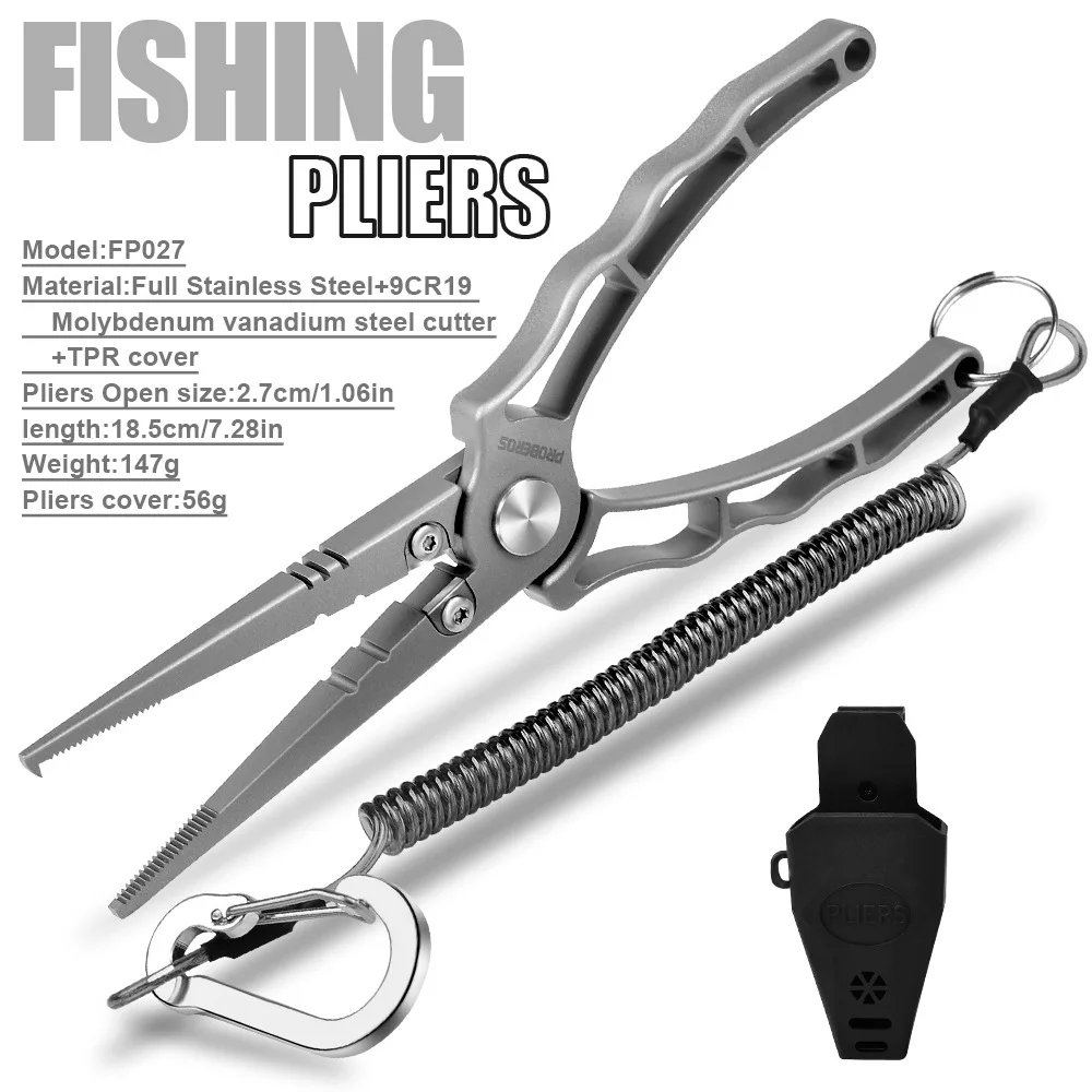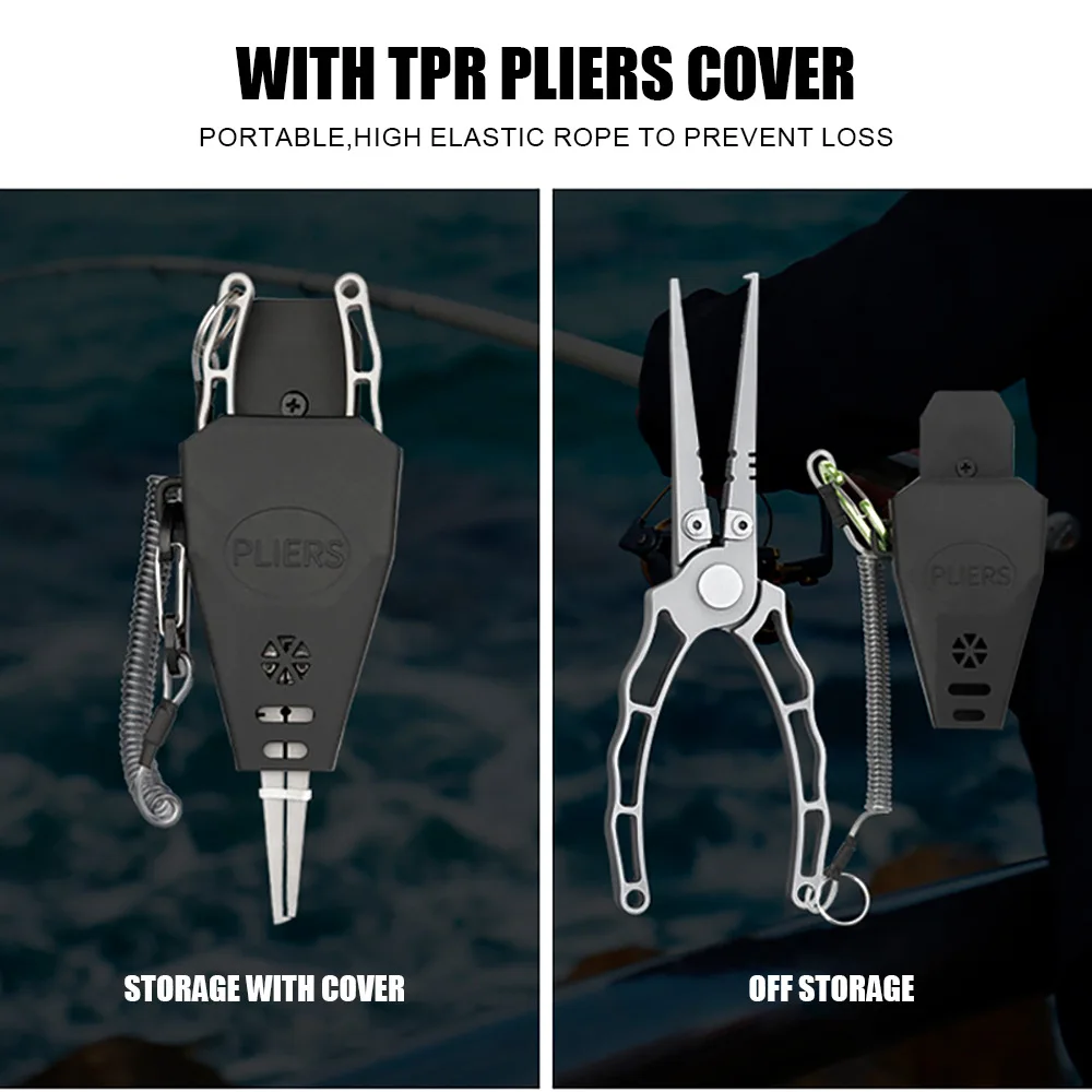 Tijeras cortadoras de línea, alicates de pesca con señuelo de 18,5 cm, gancho de punta larga resistente, herramientas removedores multifuncionales con funda de acero inoxidable