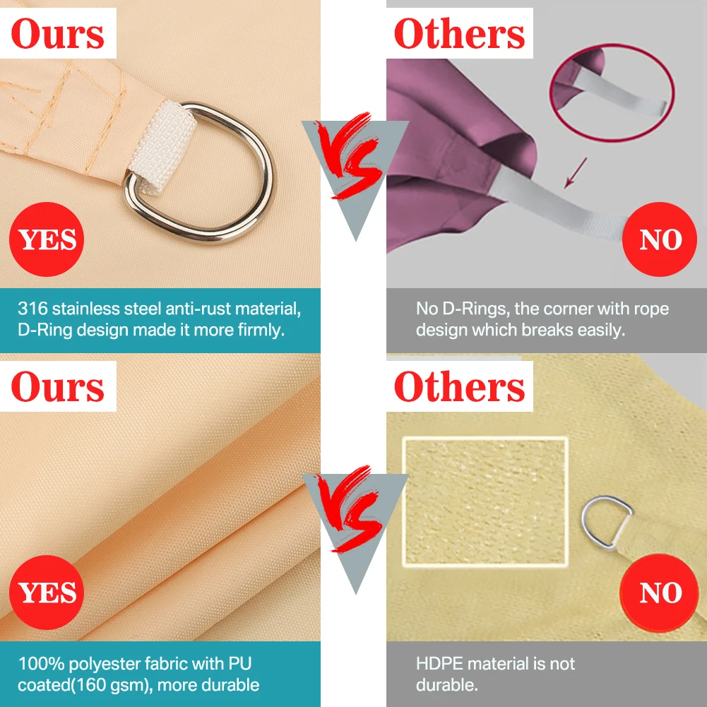 Nuestra vela de sombra es ampliamente utilizada sobre un patio, césped, jardín, piscina, estanque, cubierta, patio trasero, patio trasero, parque, cochera, pérgola, caja de arena, entrada, U otra zona exterior. Reduce eficazmente el calor en tus zonas de estar al aire libre.