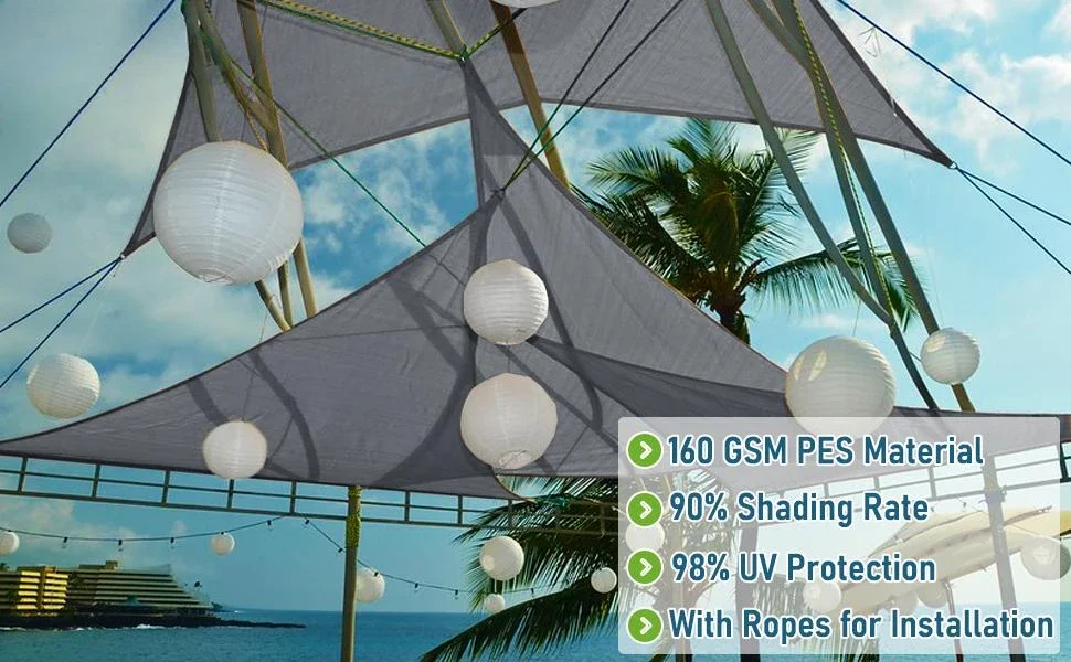 TELA PREMIUM:Nuestra vela de sombra está hecha de tela de poliéster con un revestimiento de PU de 160 g/m2, lo que la hace saludable y segura de usar.Es altamente resistente al agua, desgarros y condiciones climáticas adversas, lo que lo hace perfecto para un uso prolongado.La vela de sombra viene con tres almohadillas y regalamos tres cuerdas de viento 1800D (200 cm para cada una) para una fácil instalación.Cuenta con costuras resistentes en cada lado y anillos en D de acero inoxidable en cada borde para garantizar una instalación segura.PROTECCIÓN UV:Nuestros velas de sombra pueden proporcionar hasta un 98 % de protección UV y una tasa de sombreado del 90 %, lo que puede ayudar a reducir la temperatura del aire ambiente y reducir los costos de enfriamiento y el consumo de energía.Es más, con el diseño adecuado, puedes ahorrar mucho dinero.Elija nuestros productos para disfrutar de una experiencia al aire libre más segura y cómoda que también sea sin preocupaciones y rentable.