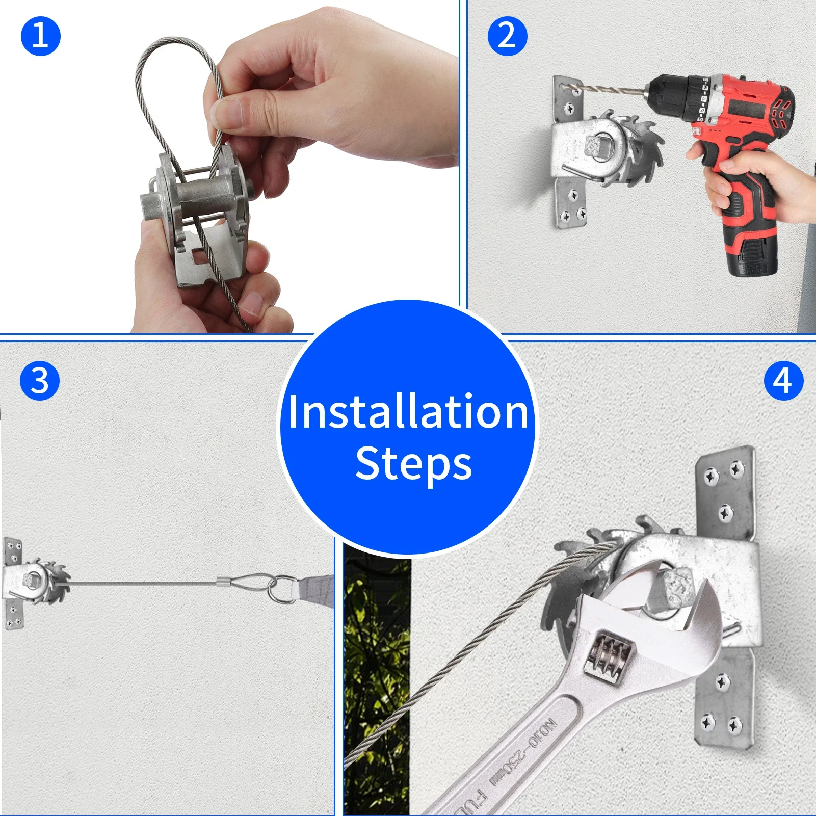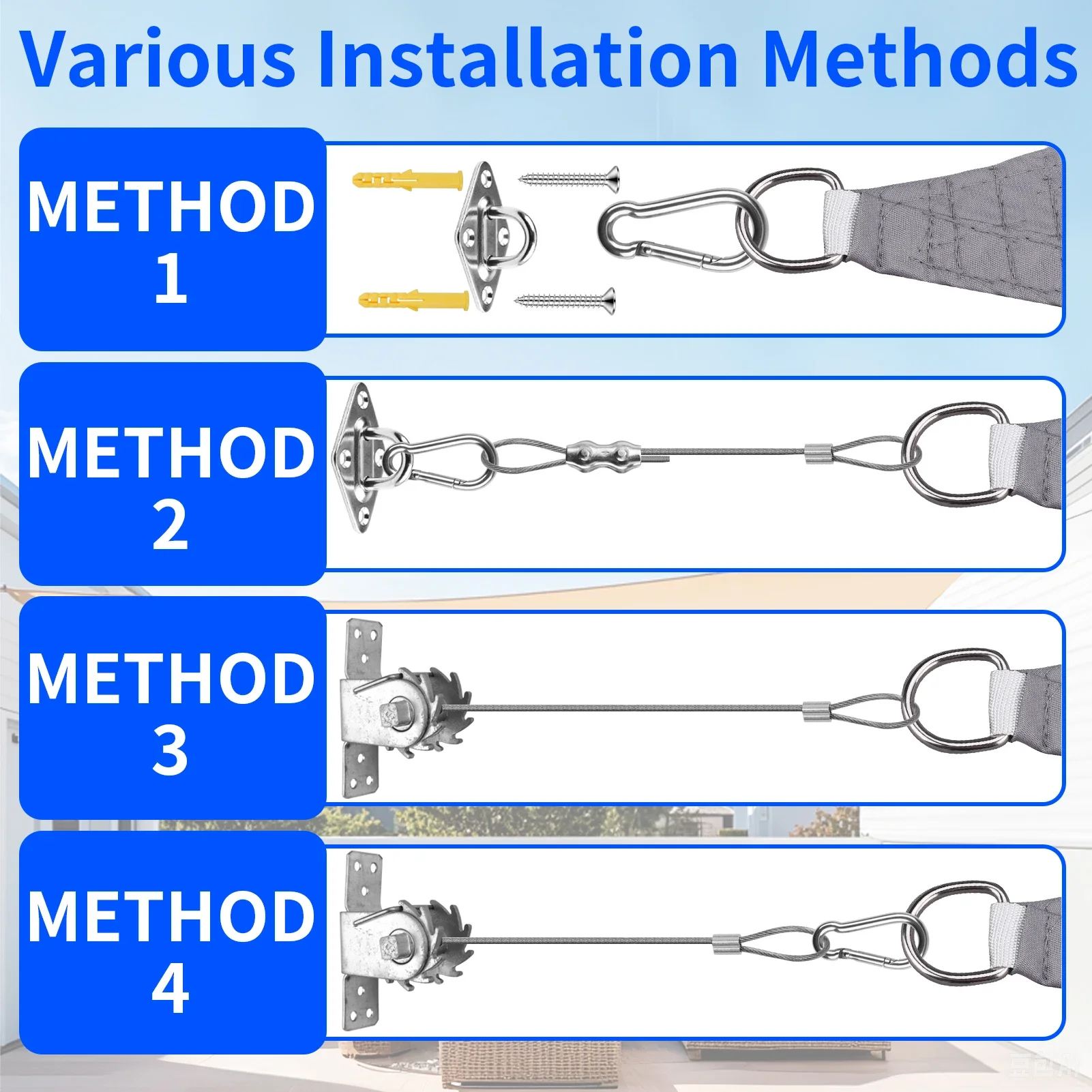 🛠️【Kit de herrajes para parasol de 60 piezas】Incluyendo2 cabrestantes de trinquete.Cables de alambre de 4x2M,2 x ojos de almohadilla,4 clips para cables de poste M422.6 mosquetones.20 tornillos,20 pernos de expansión de plástico.