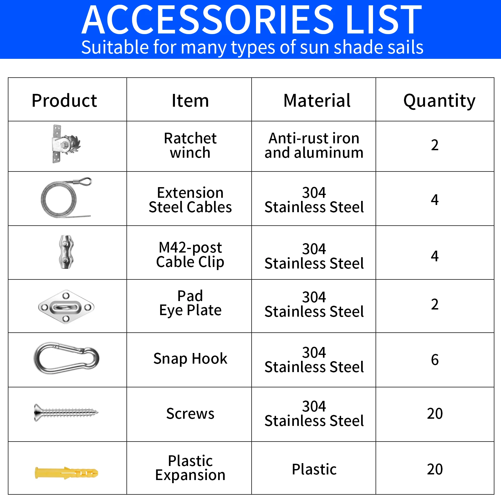 HIGH QUALITY:Made of 100% polyester fabric with PU coated(185 gsm), more healthy and safe. Resistant to water, tears and adverse weather conditions. Including four pad eyes. Free giving 4*1800D wind ropes (200cm for each), robust sewing processing on each side, stainless steel D ring on each edge, firmly guarantee fastness of installation.