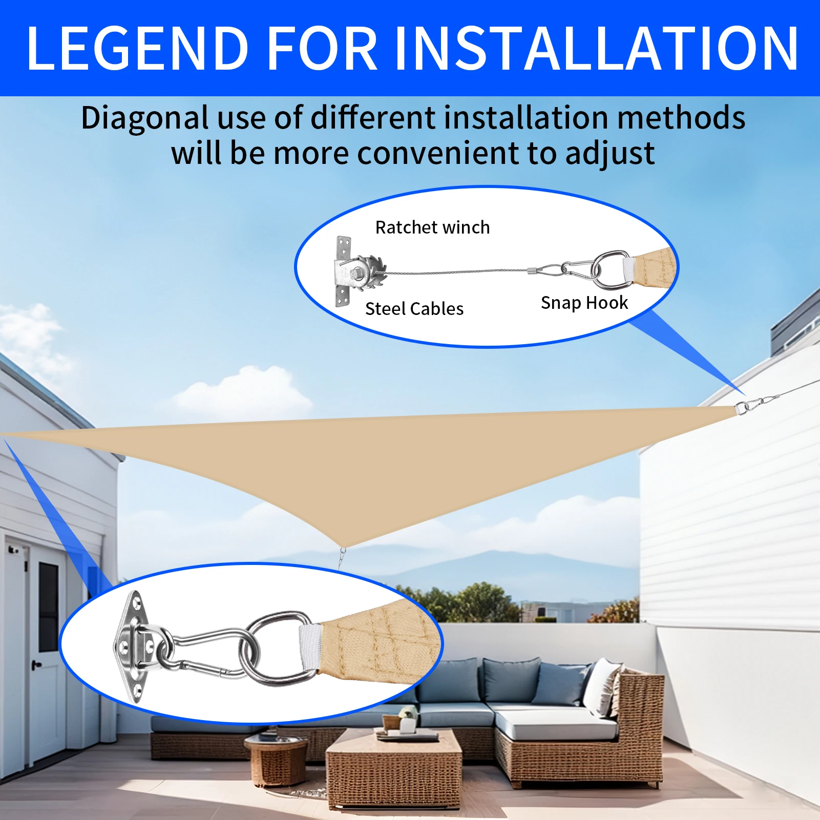 You can use it wherever you need; Simple and safe installation with rope. Suggests that the installation angle is 20-40 degrees, to achieve maximum tension and also to allow rain to run off.