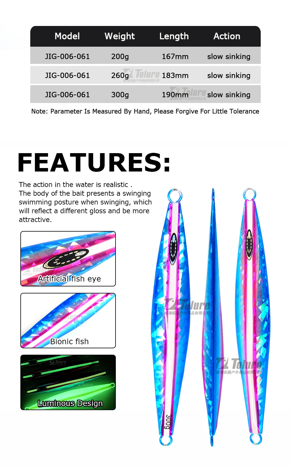 TOLU-Plantilla de Metal de hundimiento lento, señuelo de pesca en agua salada, 200g, 260g, 300g