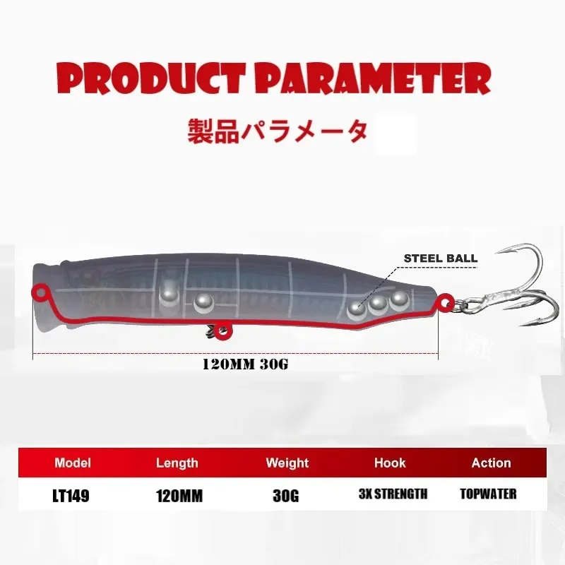 Cebo duro Artificial de 120mm y 30g para atún de mar GT Feed Popper CFP120 flotante en alta mar para Bonito Black Fin Sea Bass Bream LureFeed Popper 120, es un señuelo Popper flotante de 30 gramos y 12cm que ha sido diseñado para apuntar a la lubina y la dorada.