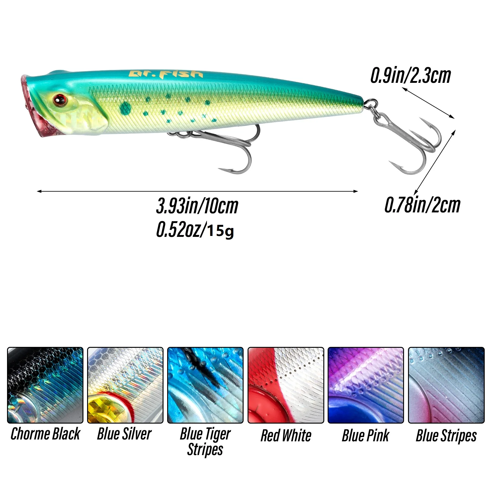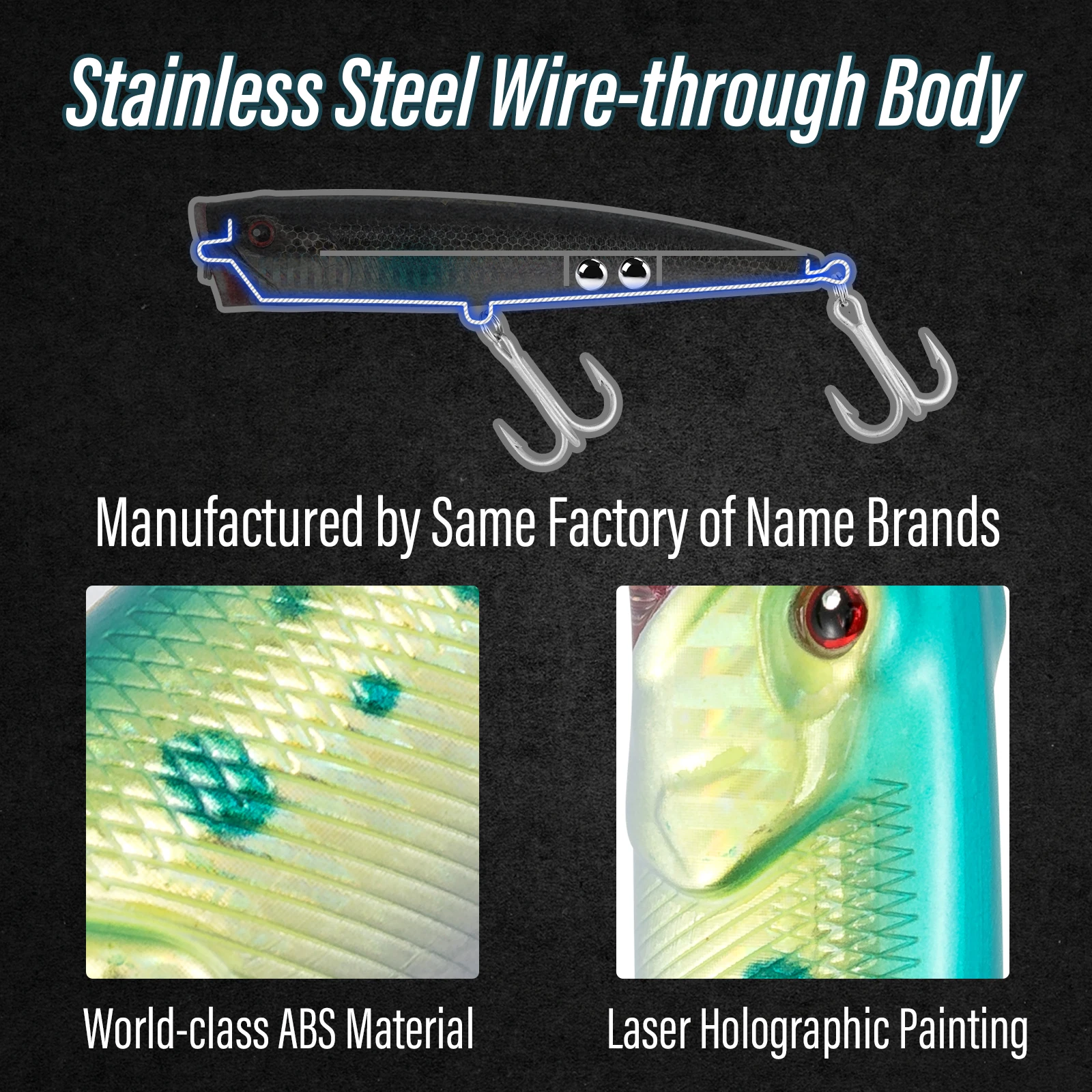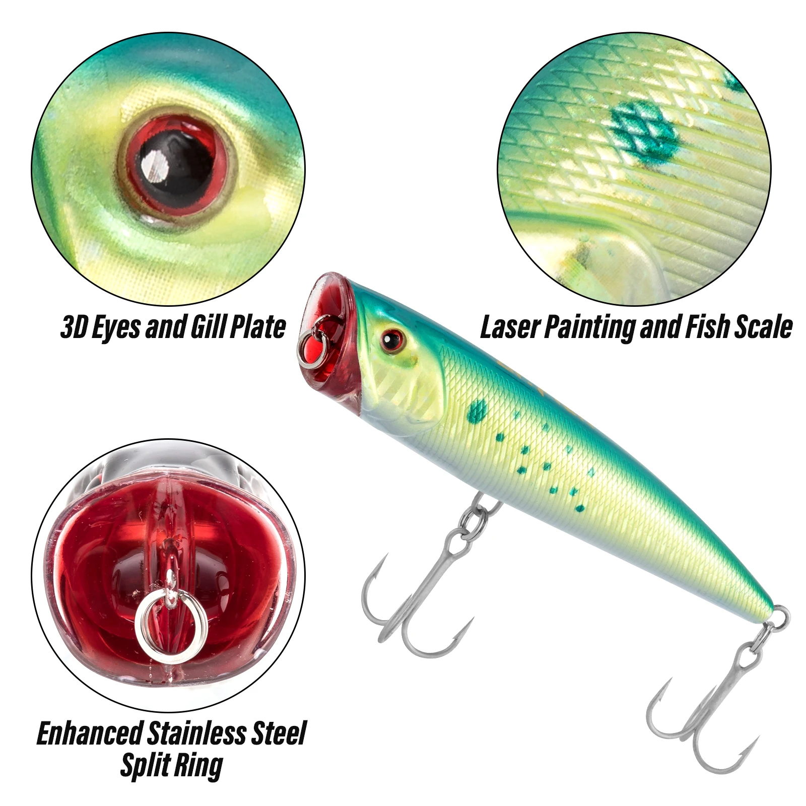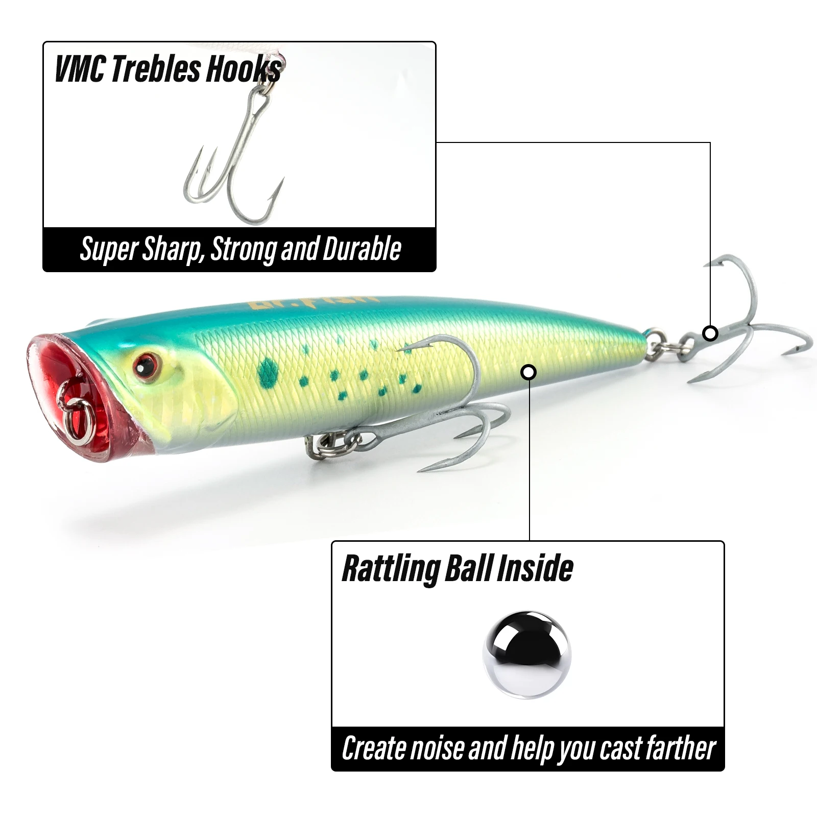 El Popper de forma clásica con un nuevo diseño de boca de copa ofrecerá una acción de estallido mucho más agresiva para provocar más picaduras. La boca de la copa y las bolas de acero generarán un fuerte gorgoteo y traqueteo para llamar a los peces desde la profundidad.