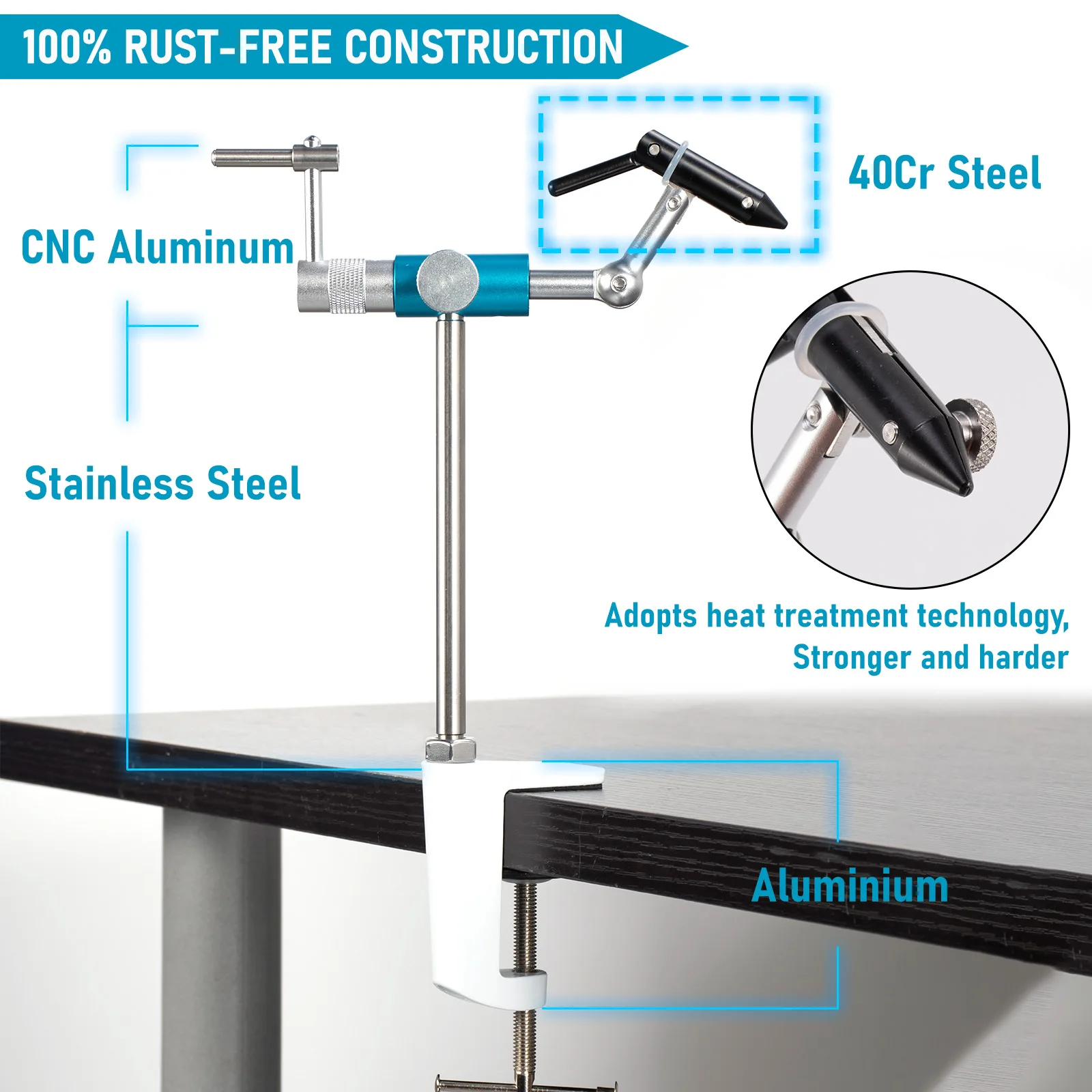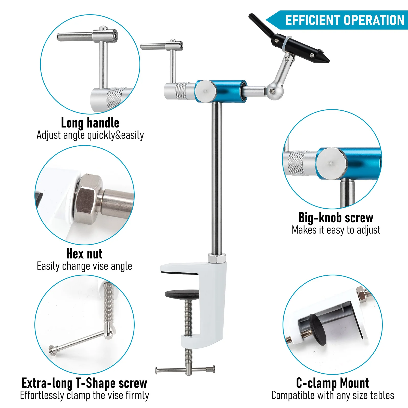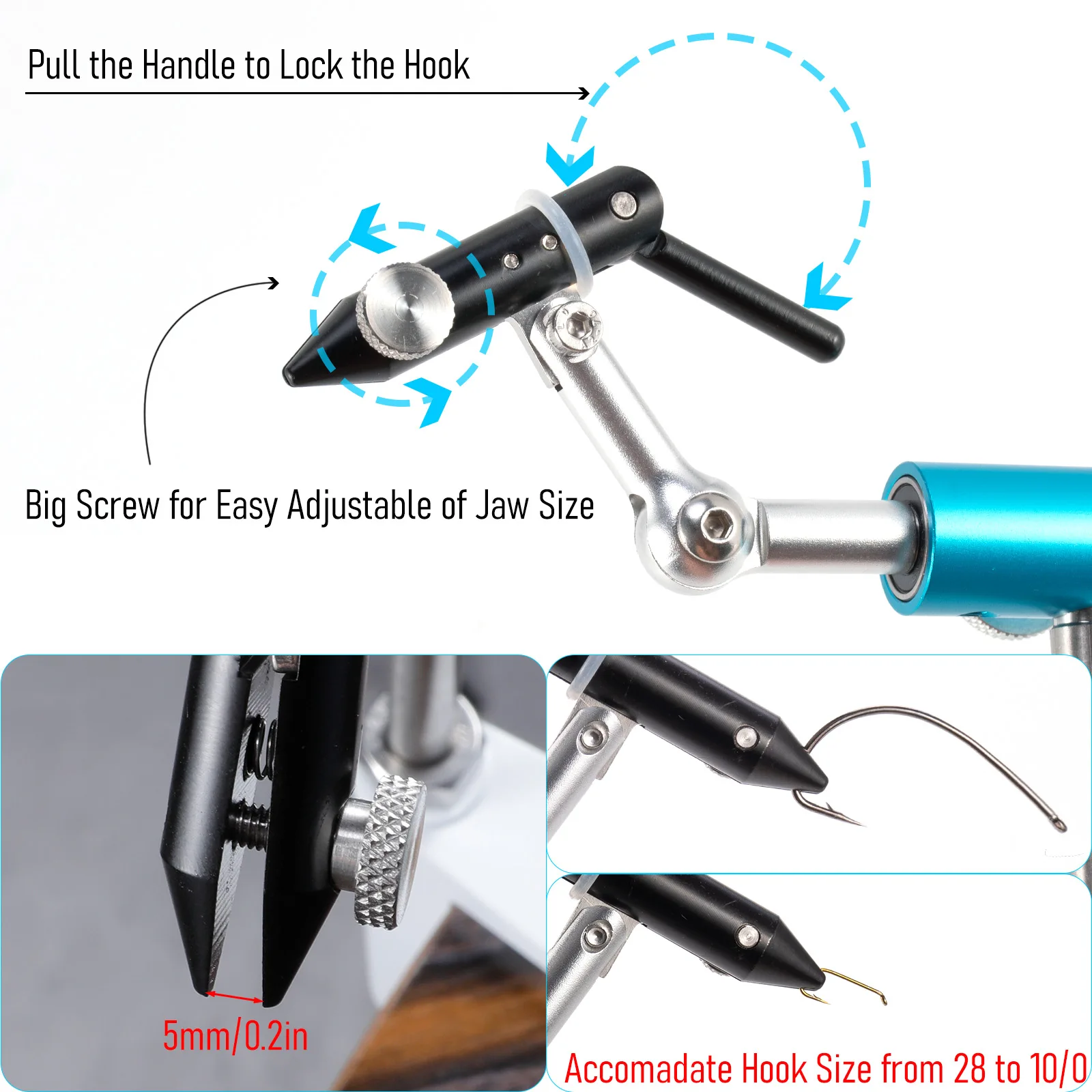 Tornillo de banco giratorio diseñado para una eficiencia de atado óptima y facilidad de ajuste. Incluso se revisó el más mínimo malestar detectado a partir de la prueba, le permite maniobrar la mosca sin sacarla del tornillo de banco, lo que facilita y lleva menos tiempo atar las moscas.