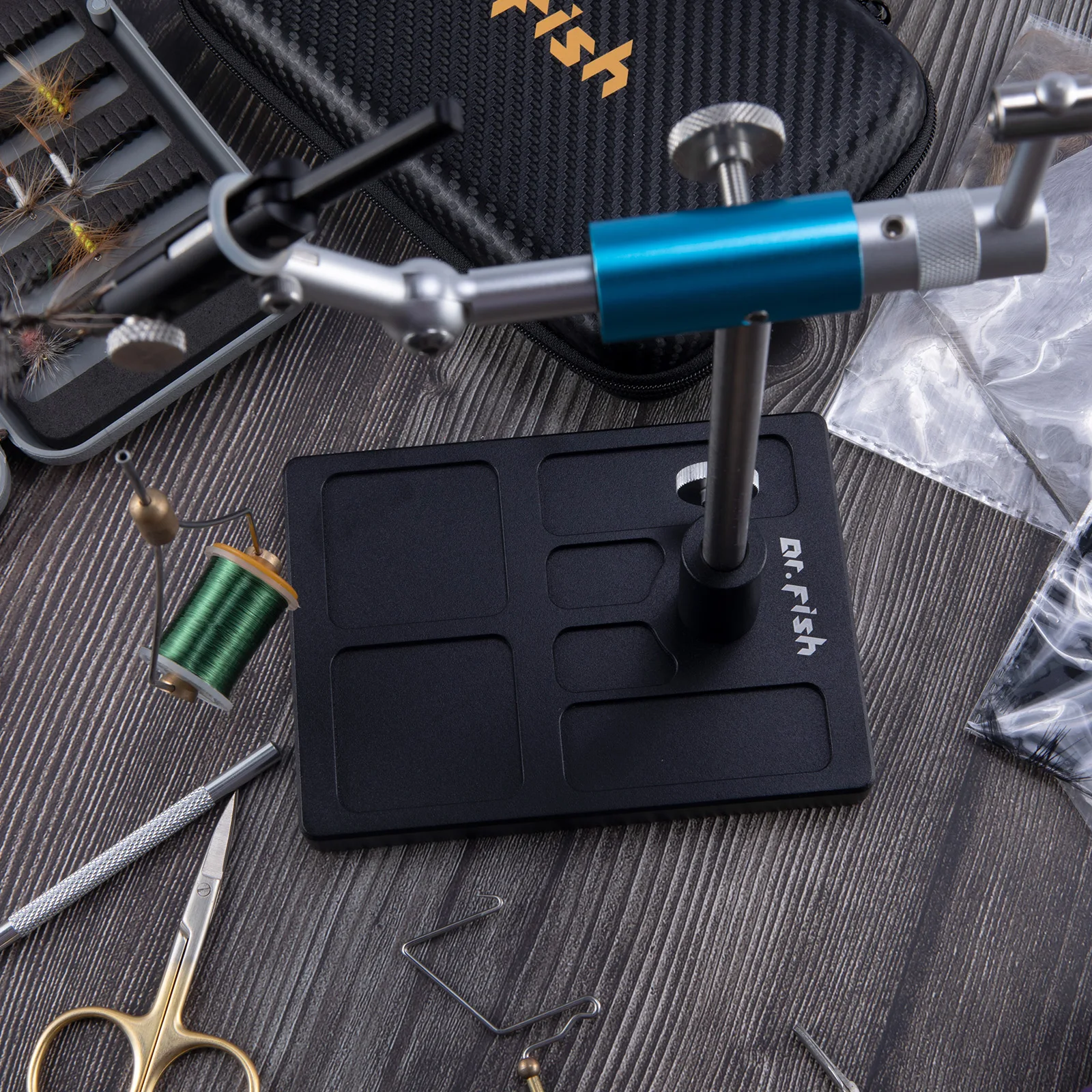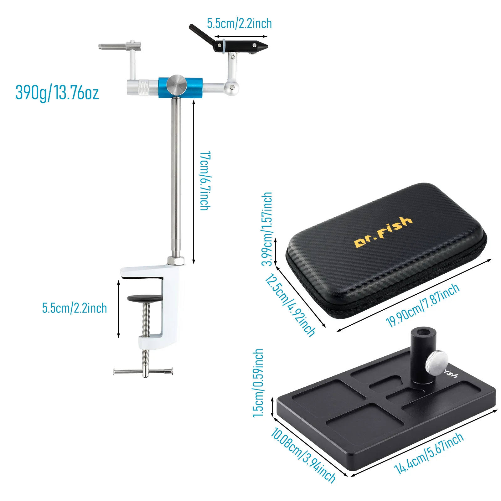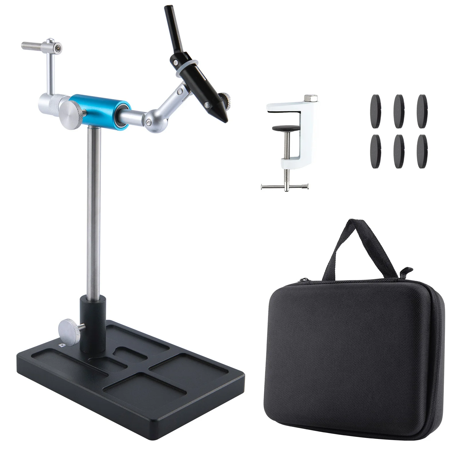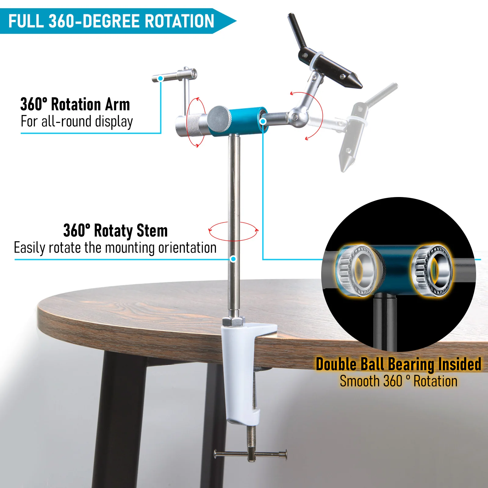 Tornillo de banco giratorio diseñado para una eficiencia de atado óptima y facilidad de ajuste. Incluso se revisó el más mínimo malestar detectado a partir de la prueba, le permite maniobrar la mosca sin sacarla del tornillo de banco, lo que facilita y lleva menos tiempo atar las moscas.