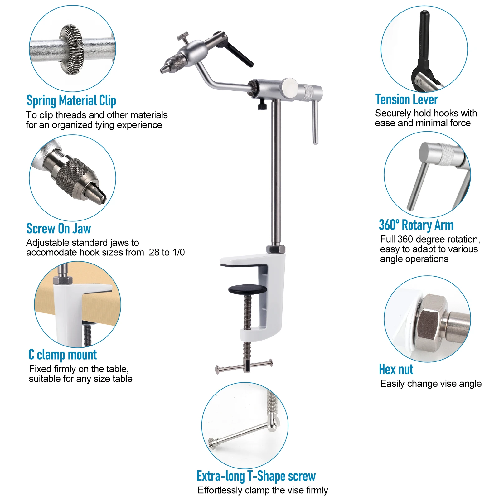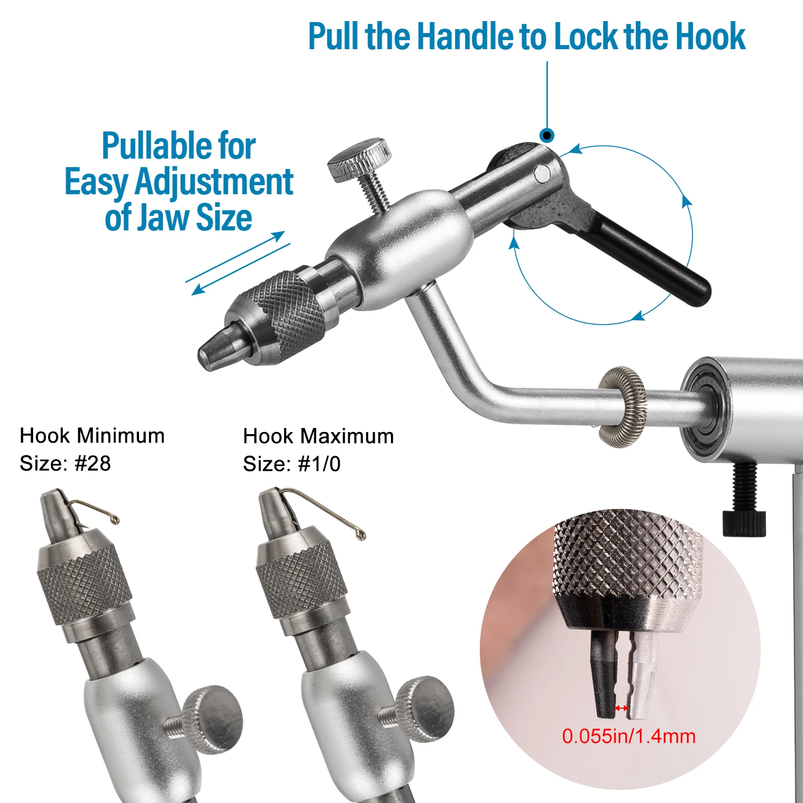 it can firmly clamp hooks of various sizes,it's opening and closing distance of the vise is 0-0.2mm, it can easily adjustable for hook sizes from 28 to 1/0