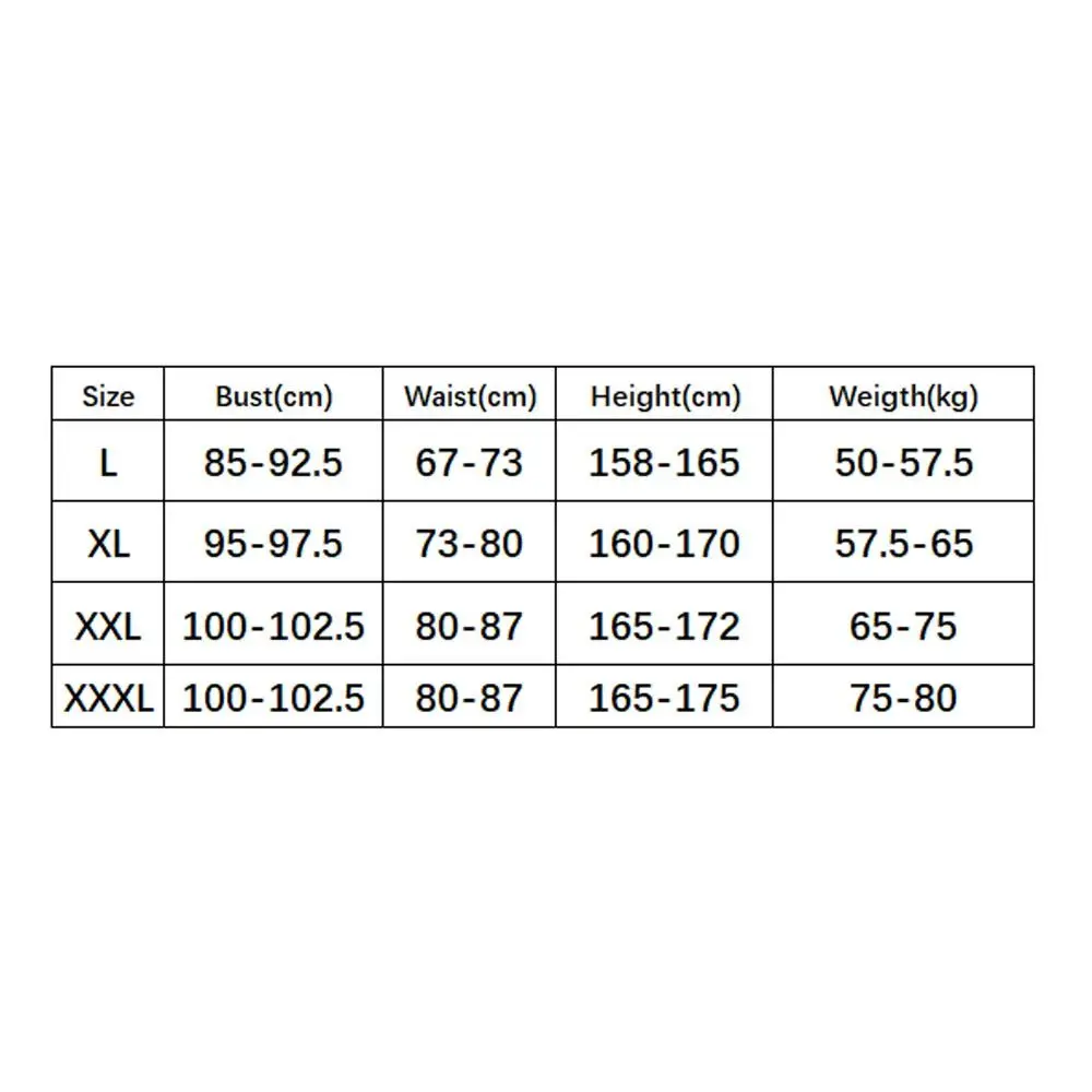 XXXL Size:Bust:100-102.5cm(39.37-40.35in),Waist:80-87cm(31.50-34.25in),Height:165-175cm(64.96-68.90in),Weigth:75-80kg