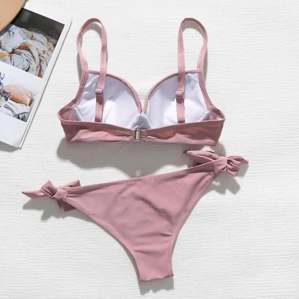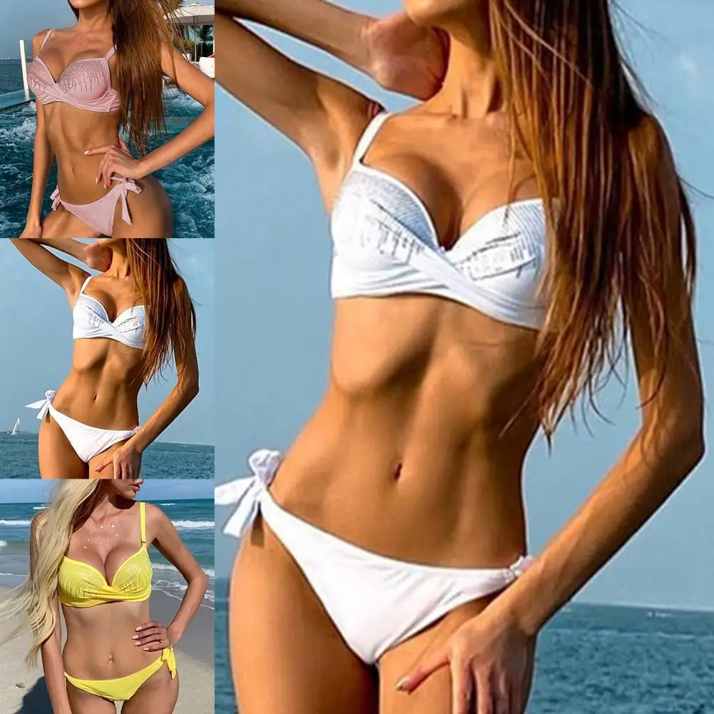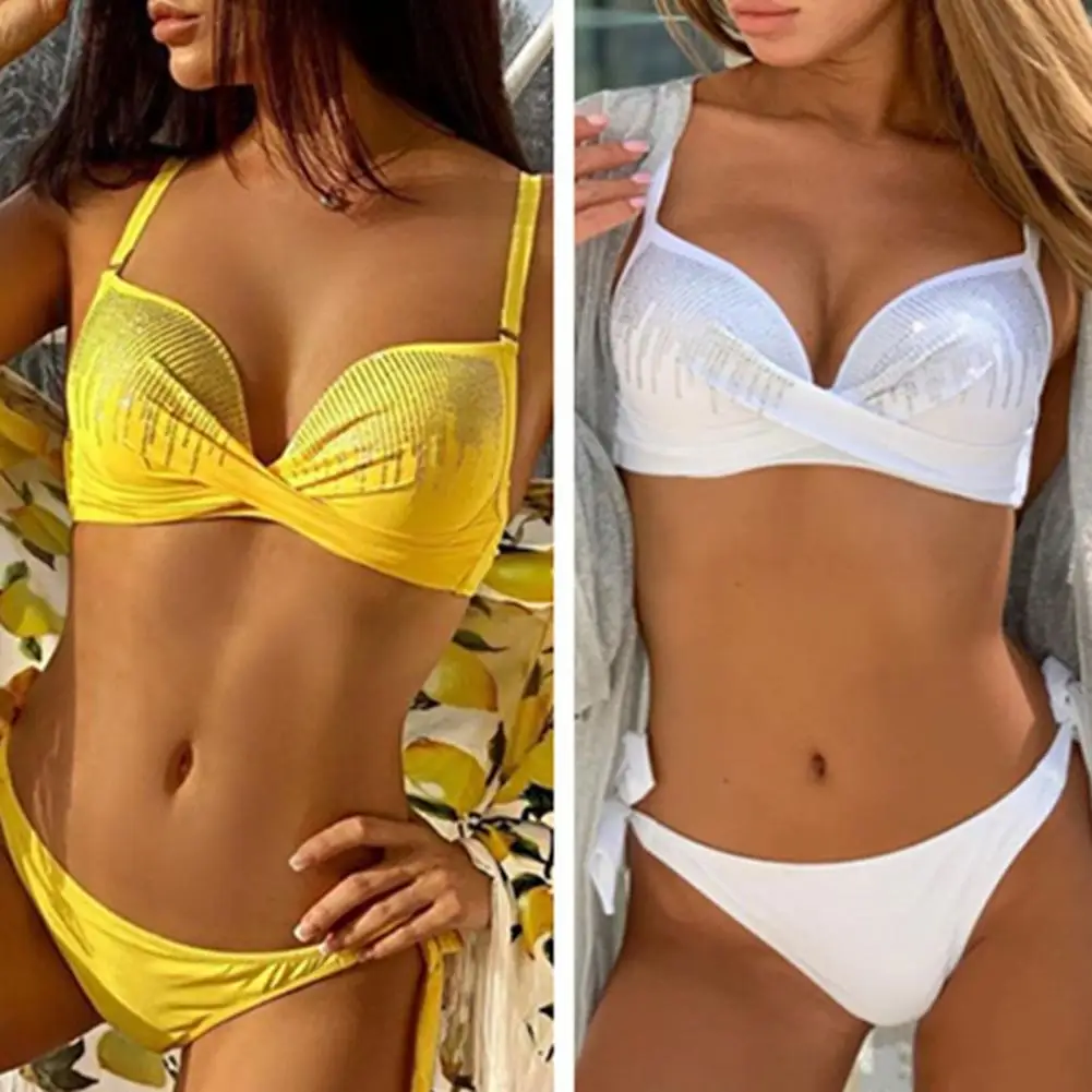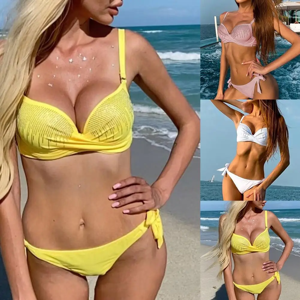 Conjunto de calzoncillos de Sujetador con relleno cruzado, vendaje lateral, decoración de diamantes de imitación, sujetador, calzoncillos de cintura alta, traje de baño para nadar