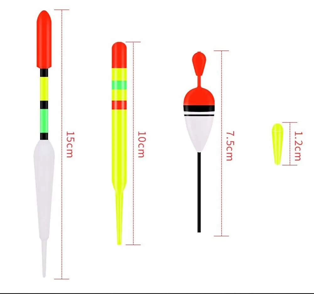 Paquete incluye: 5 unids Bobbers varilla (8cm) + 6 unids amarillo flotadores tubo (9,5 cm) + 4 unids flotador largo resbalones (15cm)