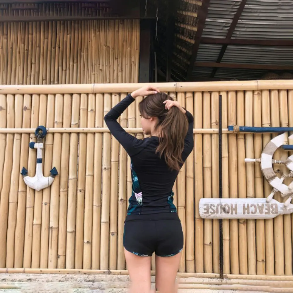 2. Característica de manga larga: Equipado con mangas largas, este traje de baño ofrece protección contra el sol y las corrientes de agua, ideal para aguas más frías o exposición prolongada.