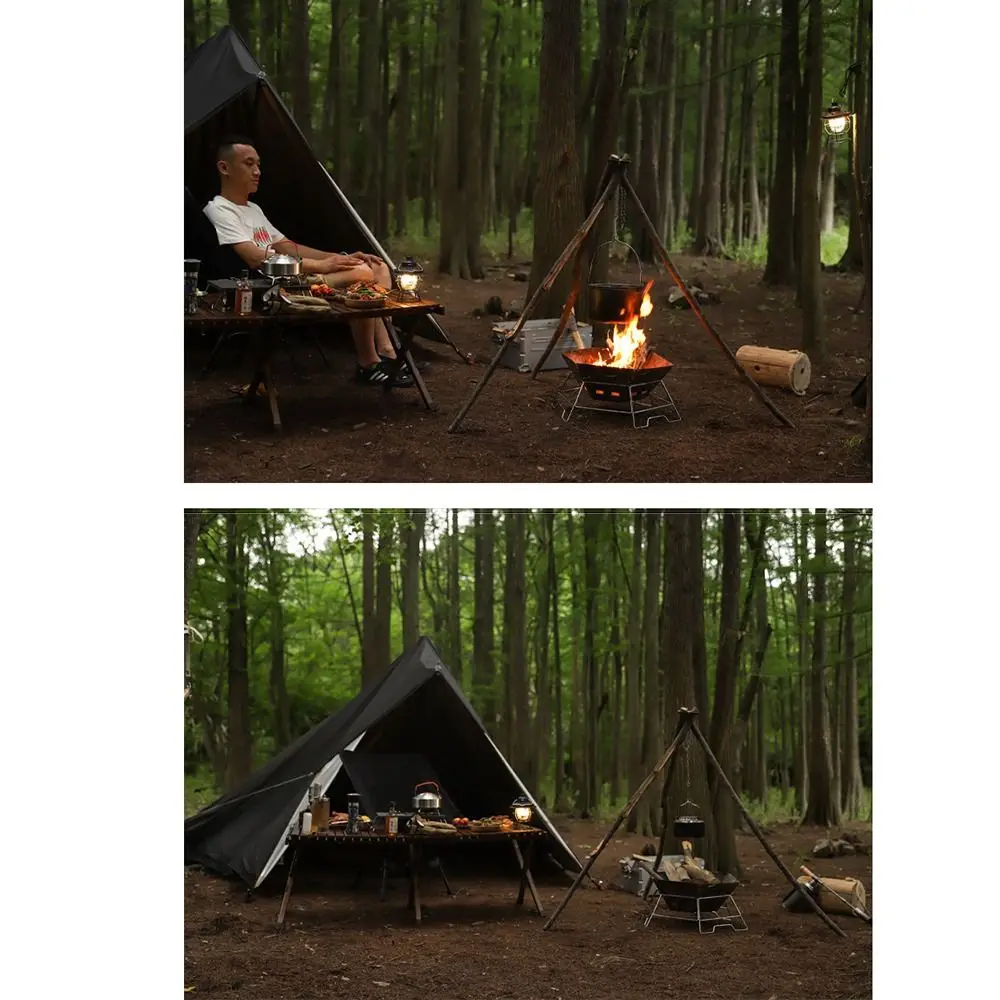 Amplia aplicación: este trípode para acampar está diseñado para colgar todos los utensilios de cocina para acampar. Ideal para acampar al aire libre, asar a la parrilla, cocinar y hacer picnics.