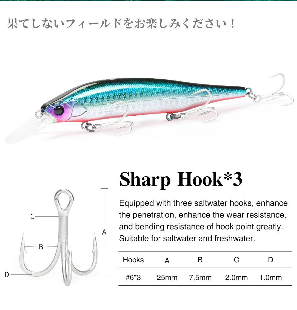 Equipado con tres ganchos de agua salada, mejora la penetración, mejora enormemente la resistencia al desgaste y la resistencia a la flexión de la punta del gancho.Apto para agua salada y agua dulce.
