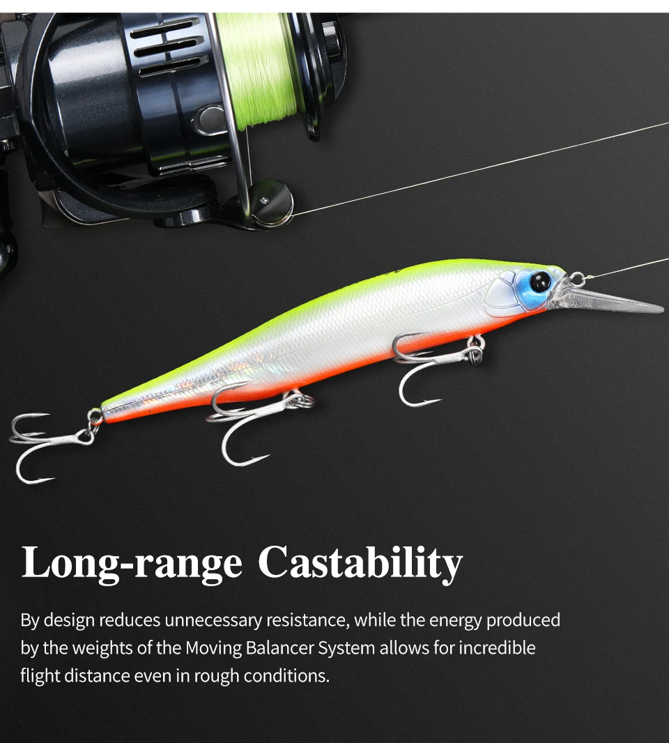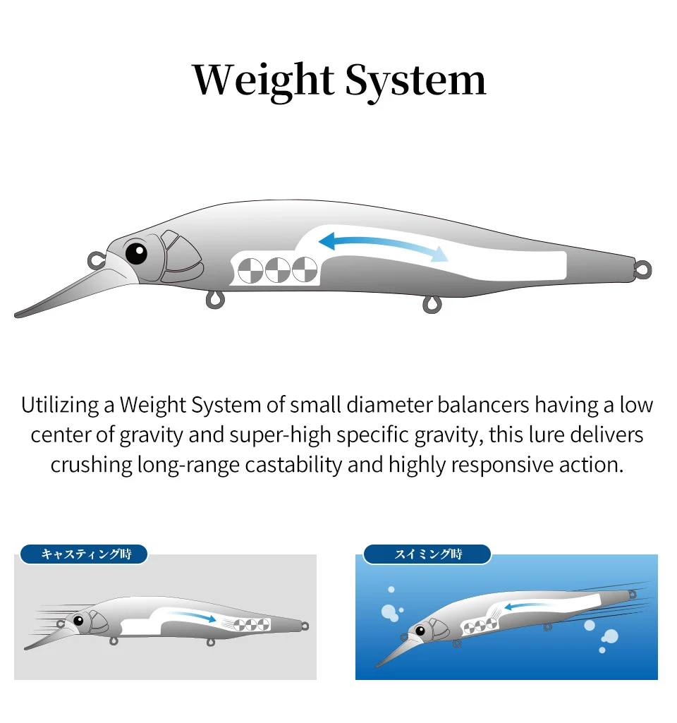 Utilizando un sistema de peso de equilibradores de tungsteno de pequeño diámetro que tienen un centro de gravedad bajo y una gravedad específica súper alta, este señuelo ofrece una crisol de largo alcance y una acción altamente sensible.