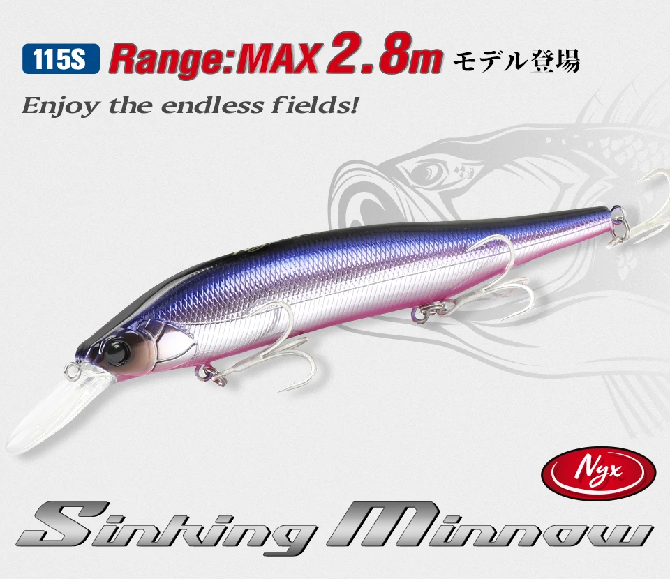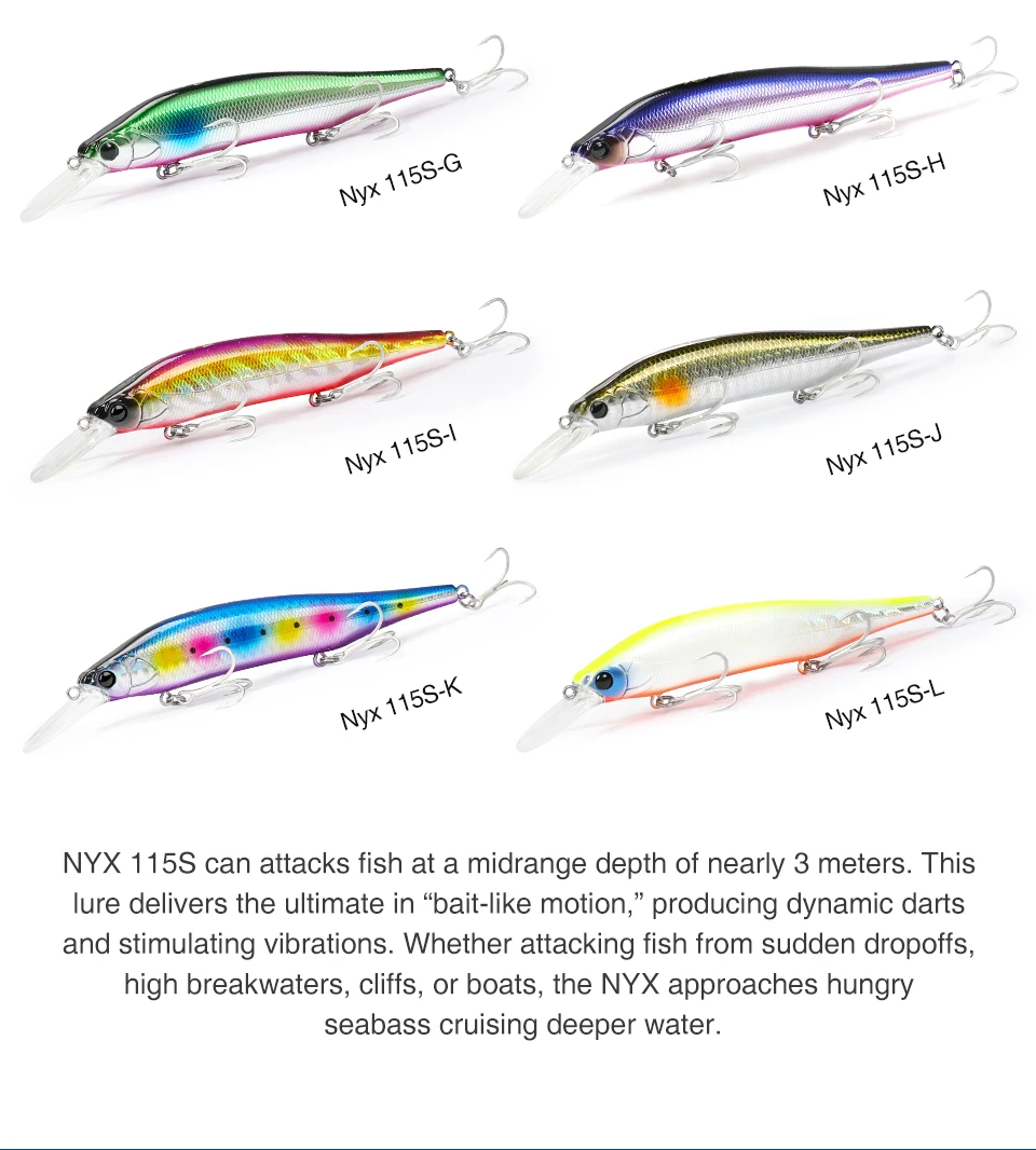 NYX 115S puede atacar peces a una profundidad media de casi 3 metros.Este señuelo ofrece lo último en "movimiento similar al cebo", produciendo dardos dinámicos y vibraciones estimulantes.Ya sea que ataques peces de excrementos repentinos, aguas altas, acantilados o embarcaciones, el NYX se acerca al crucero con aguas marinas hambrientras