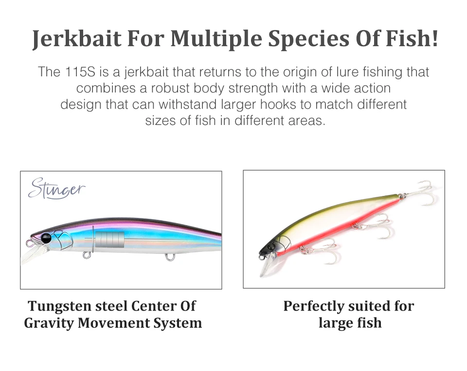 El IMP 115S es un cebo jerkbait versátil con una distancia estable y una amplia acción. Puede soportar ajustes de línea gruesa y aumentos de tamaño de anzuelo según la especie de pez, ¡mucha diversión al aire libre!
