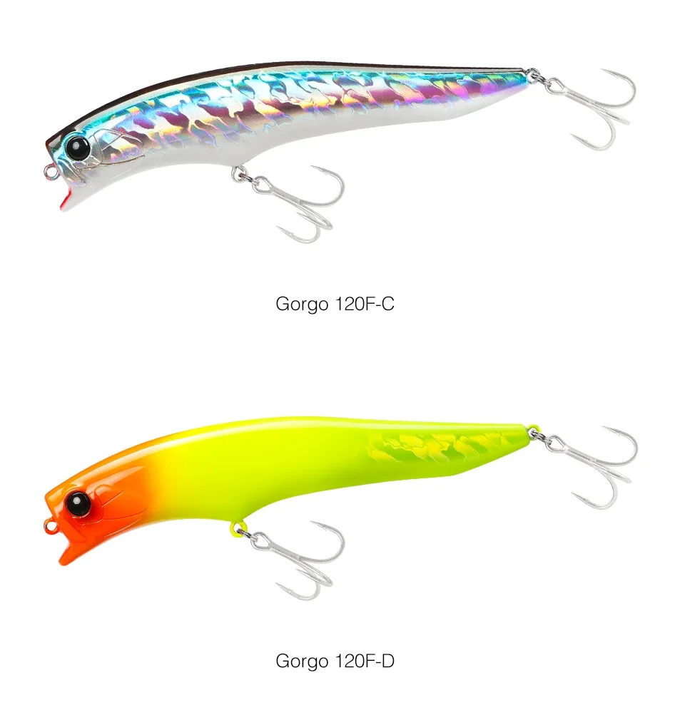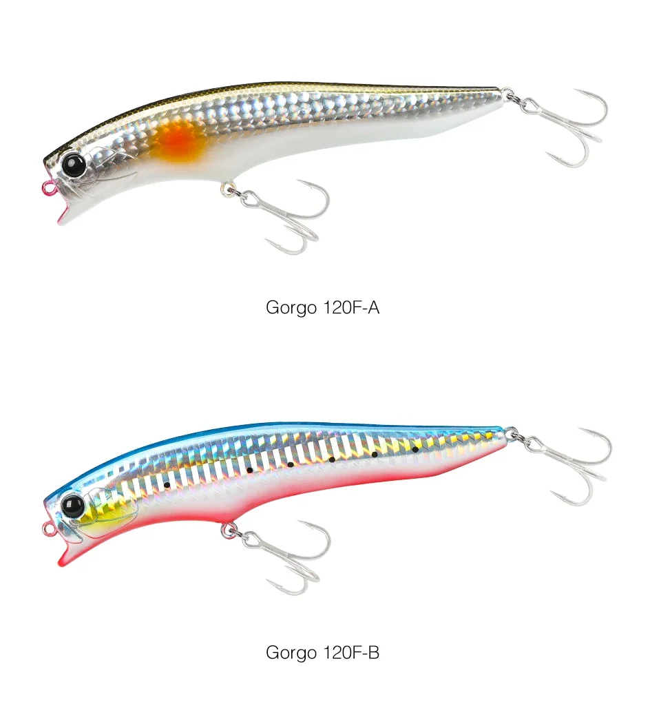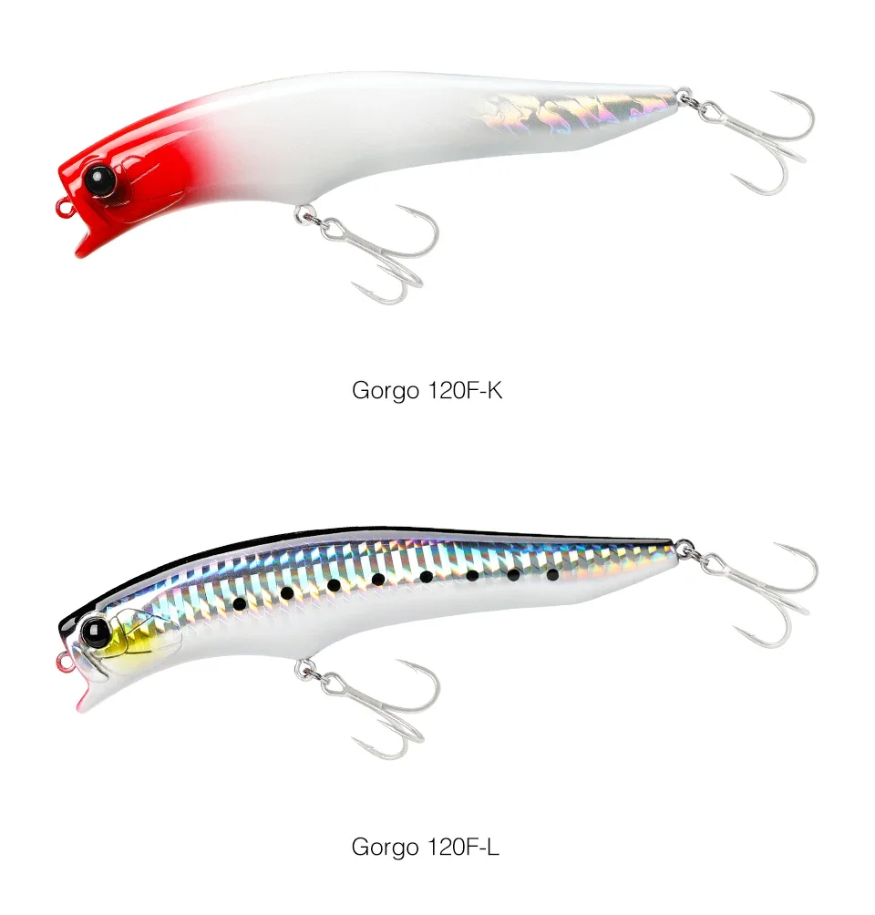 El Gorgo 120F, se utiliza una forma de señuelo especial en combinación con un sistema confiable de movimiento del centro de gravedad para un buen arranque, potencia de mantenimiento del alcance de la superficie secundaria y un fuerte atractivo de amplia acción.