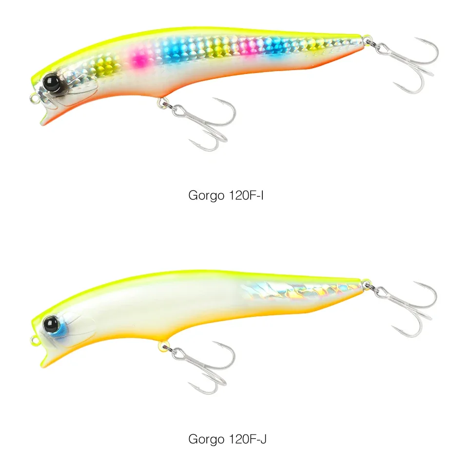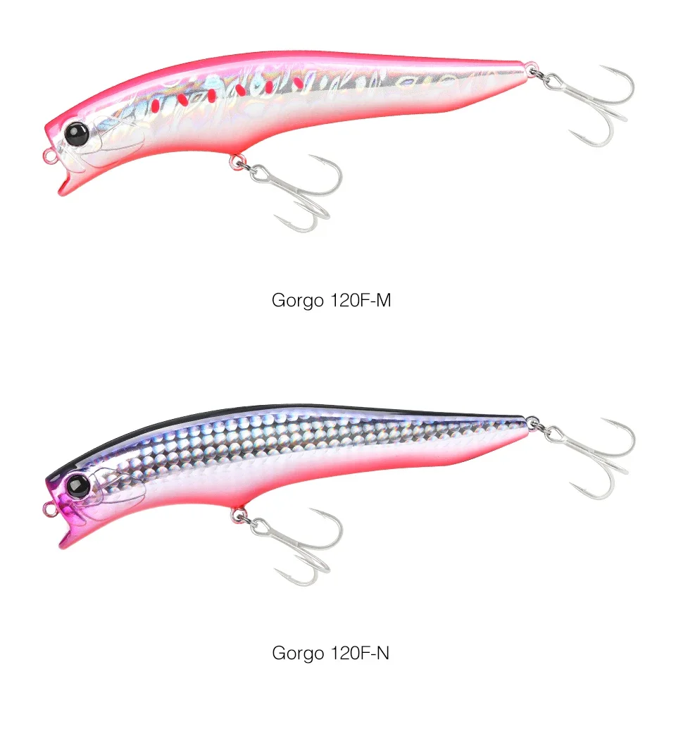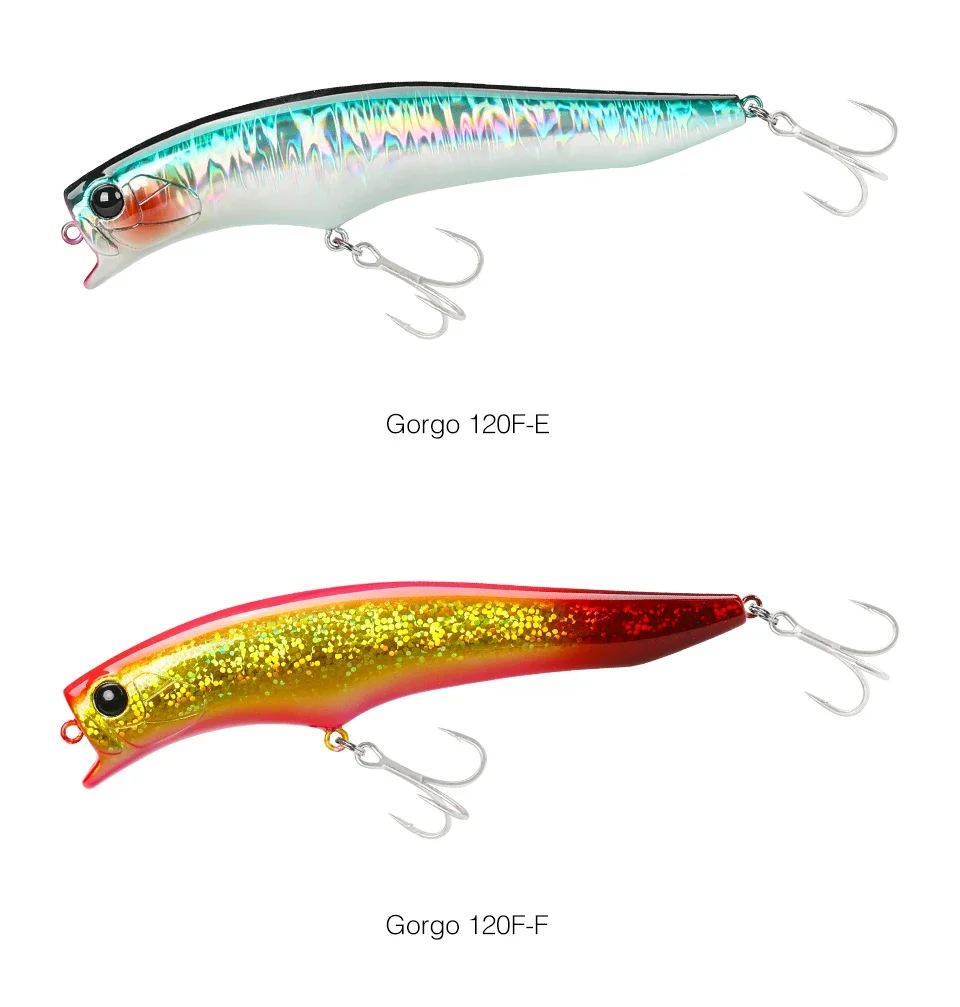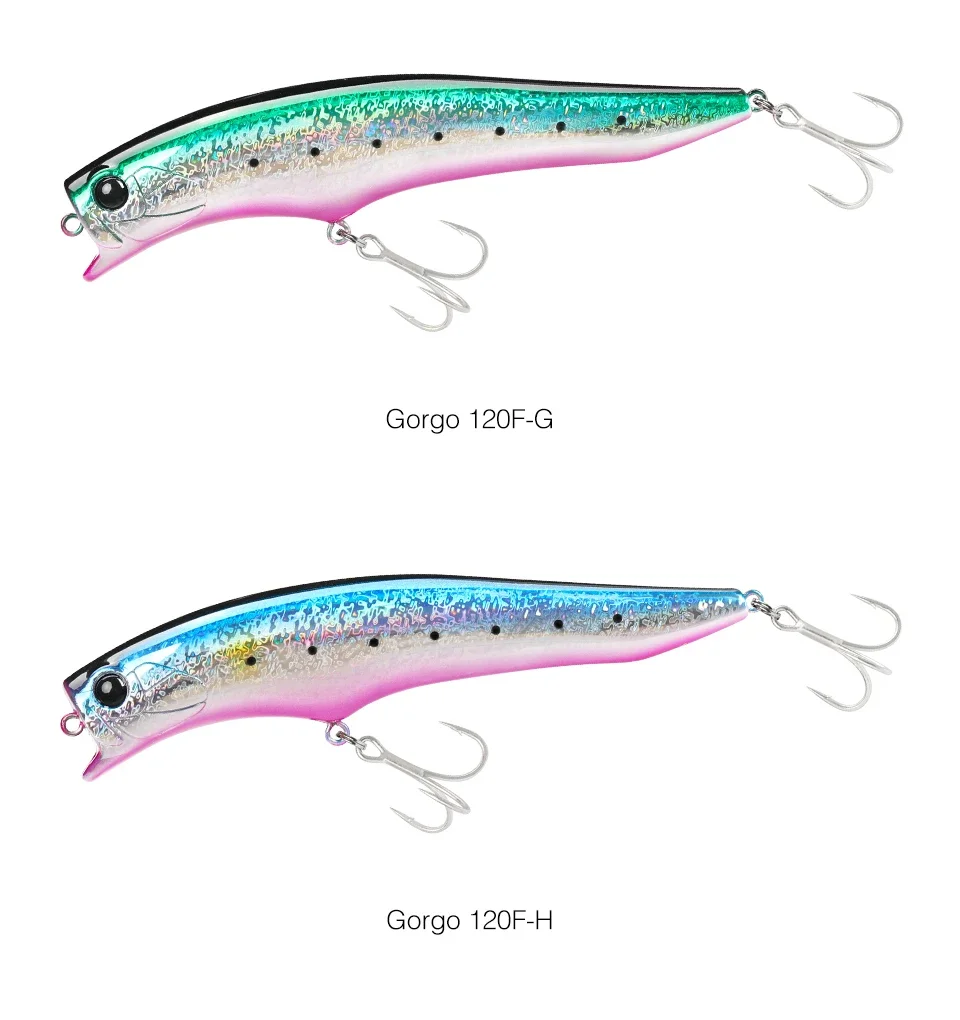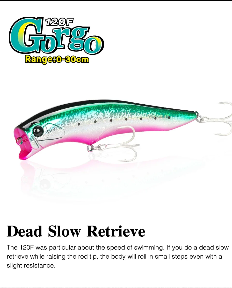 El Gorgo 120F, se utiliza una forma de señuelo especial en combinación con un sistema confiable de movimiento del centro de gravedad para un buen arranque, potencia de mantenimiento del alcance de la superficie secundaria y un fuerte atractivo de amplia acción.