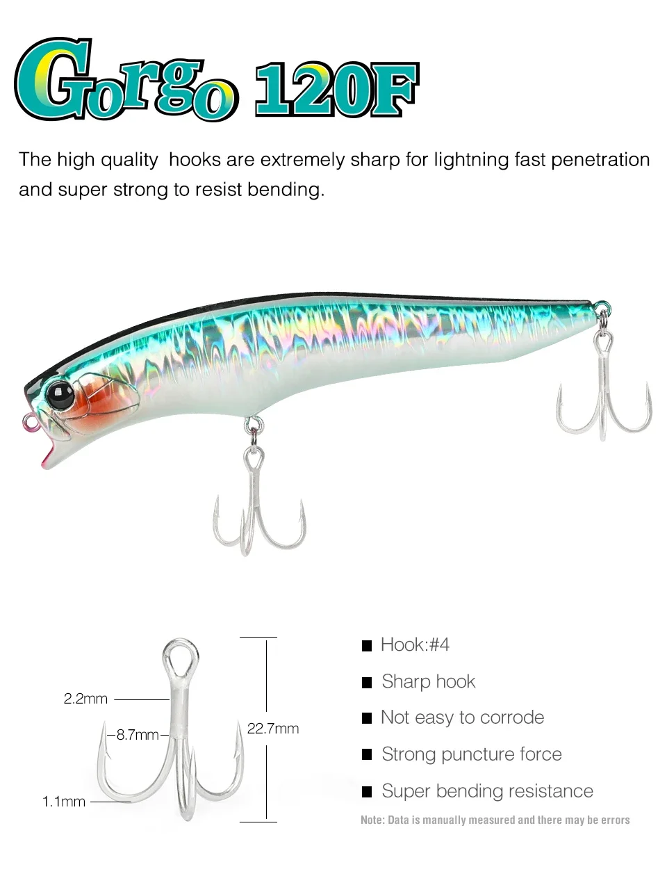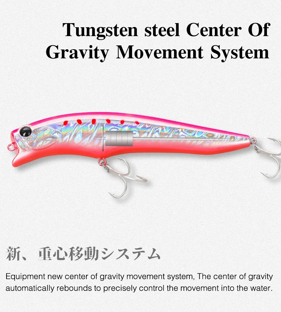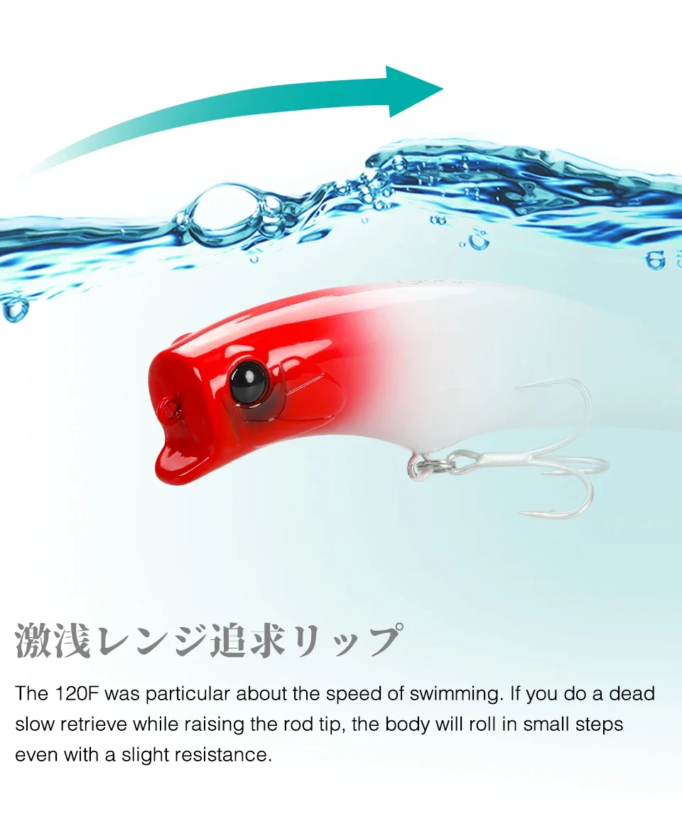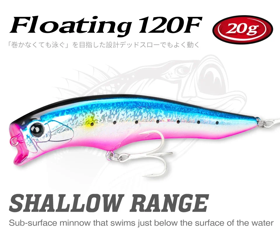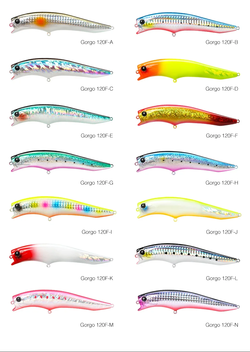 El Gorgo 120F, se utiliza una forma de señuelo especial en combinación con un sistema confiable de movimiento del centro de gravedad para un buen arranque, potencia de mantenimiento del alcance de la superficie secundaria y un fuerte atractivo de amplia acción.
