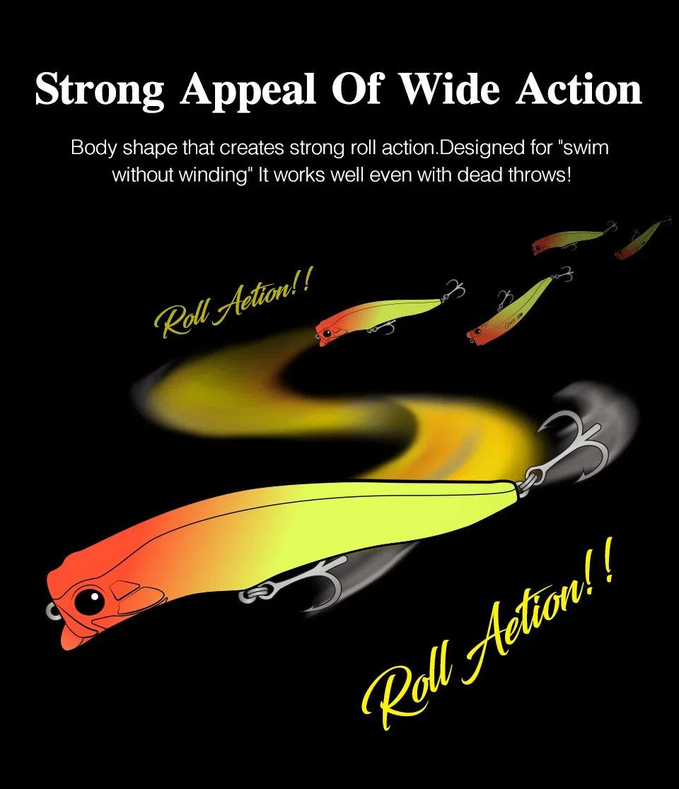Forma del cuerpo que crea una fuerte acción de rodadura. Diseñado para "nadar sin darse cuerda" ¡Funciona bien incluso con lanzamientos muertos!