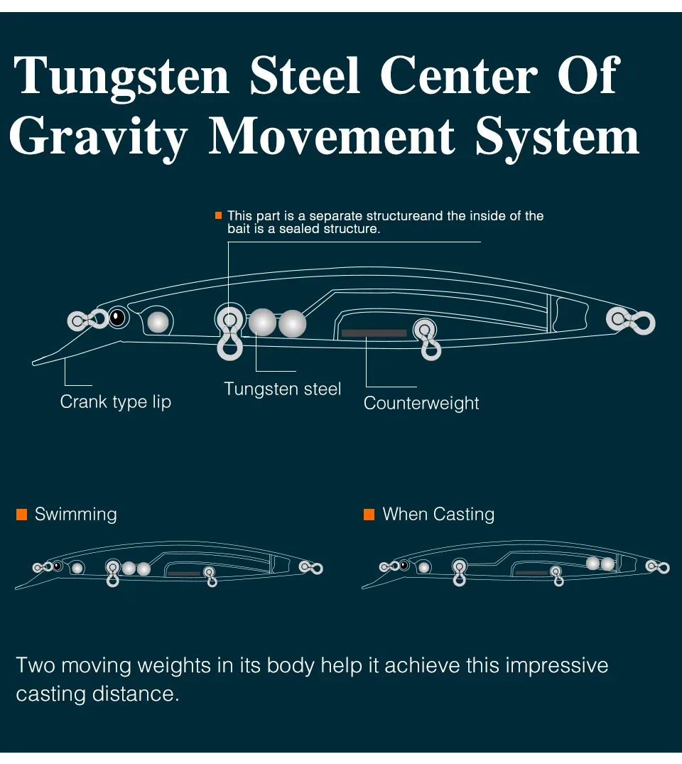 2.El cebo tiene un perfil aerodinámico y dos pesos móviles en su cuerpo lo ayudan a alcanzar esta impresionante distancia de lanzamiento.Cuando lo lanzas, ¡puede pasar de 60 a 70 metros!