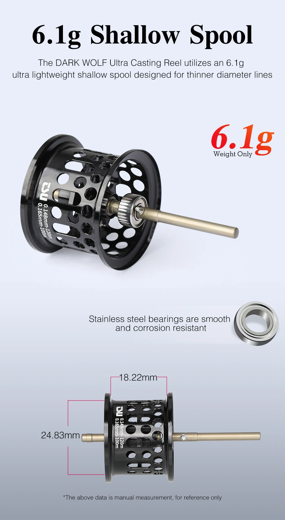 Dark Wolf Ultra, pesa solo 135 g.Carrete poco profundo de sólo 6,1 g.Nuevo modelo diseñado para líneas de diámetro más delgado.