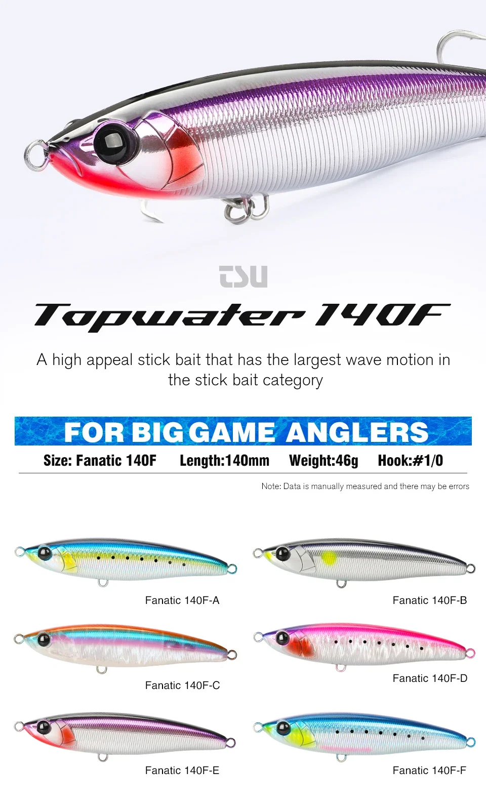TSURINOYA 140F Topwater Stick Señuelo de pesca FANÁTICO 140mm 46g Áreas profundas Barco Pesca Águas saladas Cebos duros Lápiz flotante