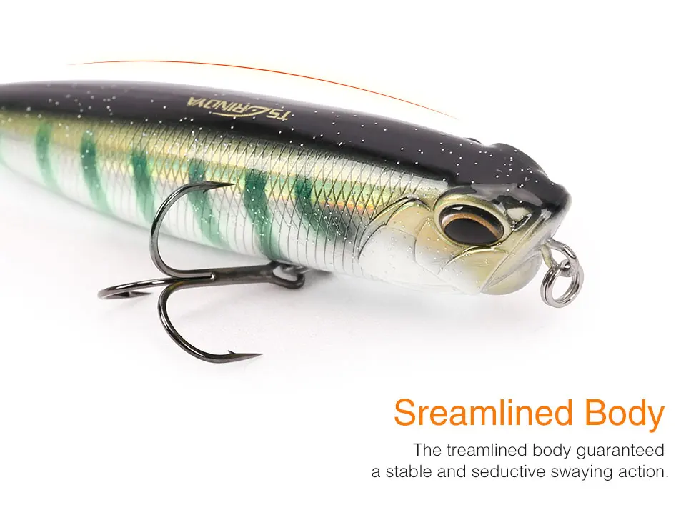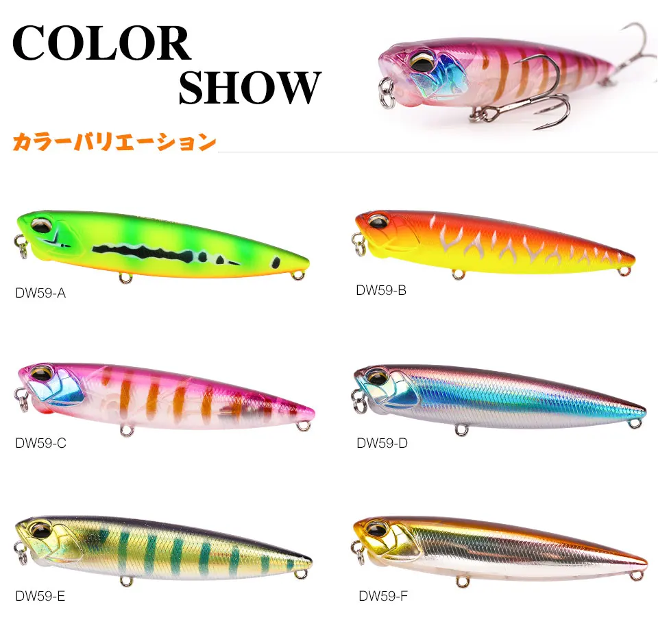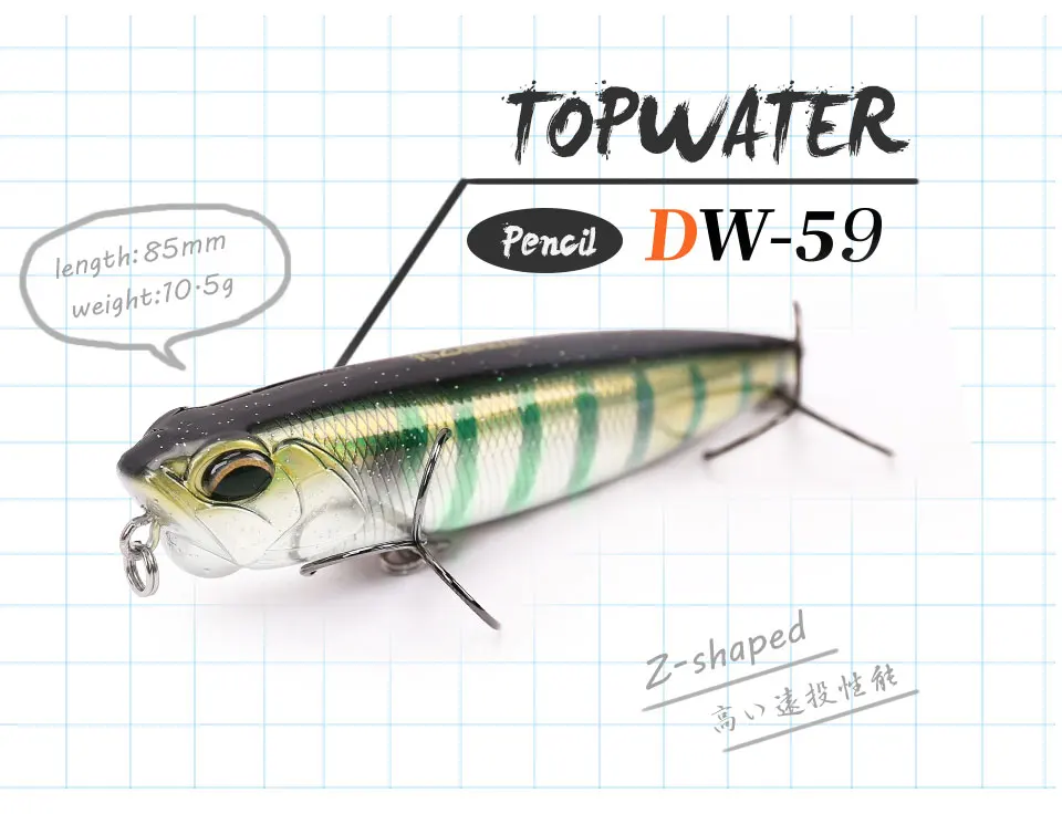 1. DW59 is a top water pencil lures.Strong body,fish scale with laser effect can reflect outer light from all sides with wonderful temptation.