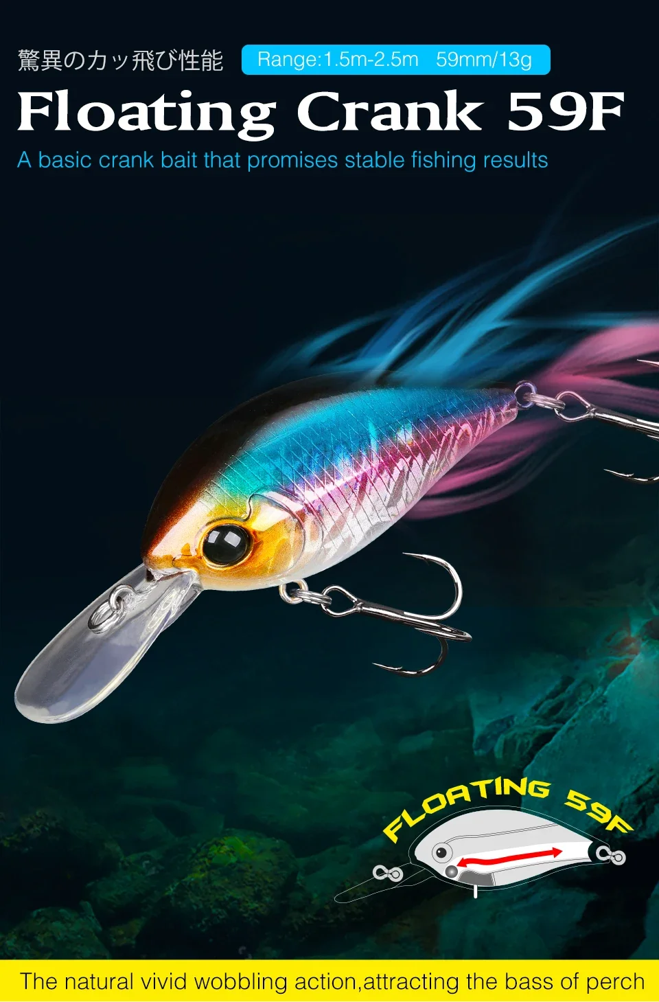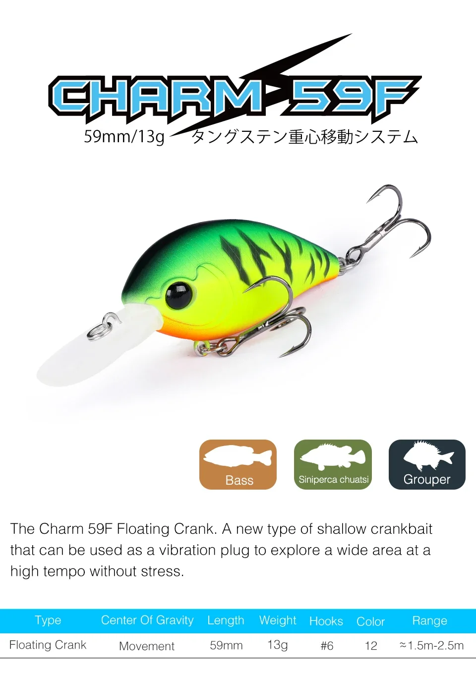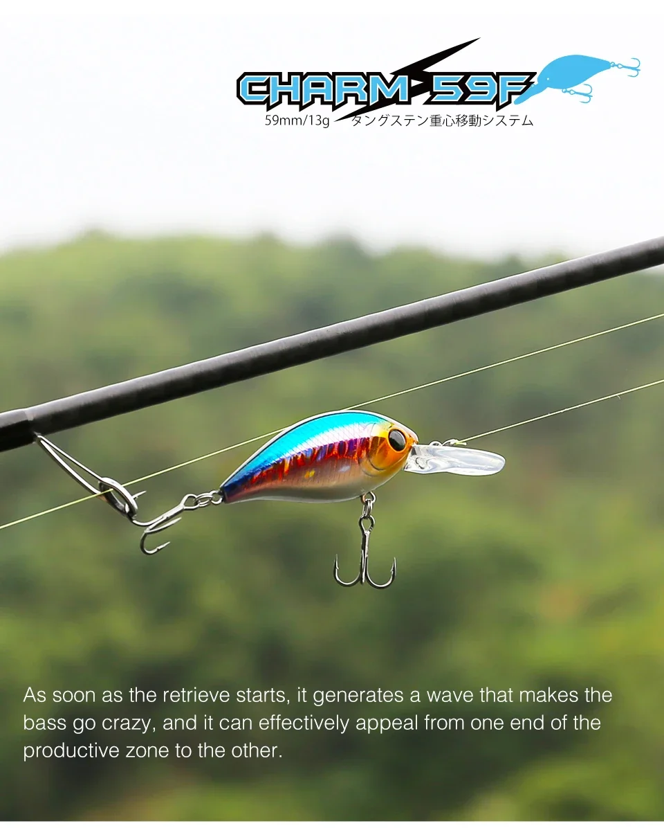 Manivela flotante Charm 59F. Un nuevo tipo de crankbait poco profundo que se puede usar como tapón de vibración para explorar un área amplia a un ritmo alto sin estrés