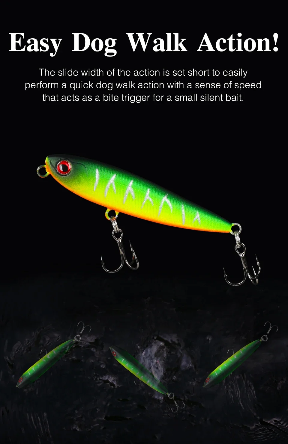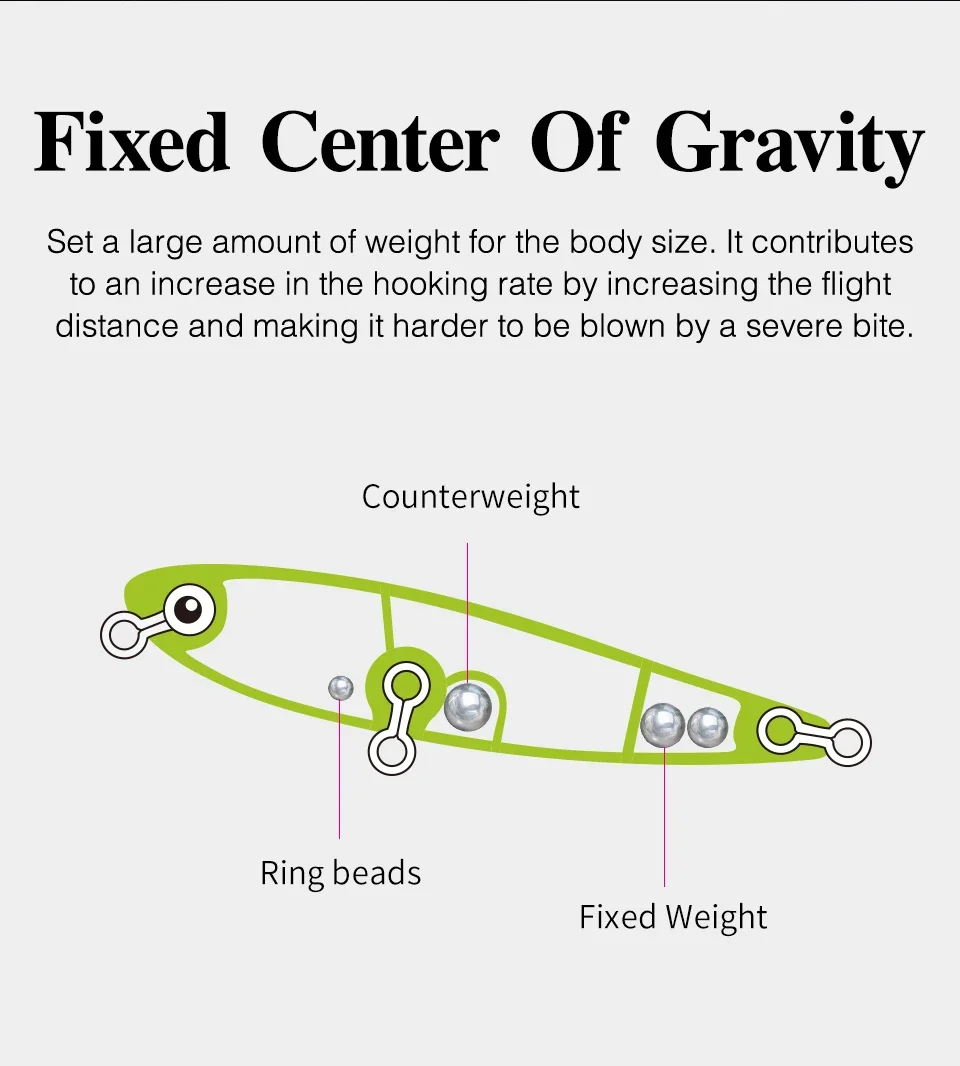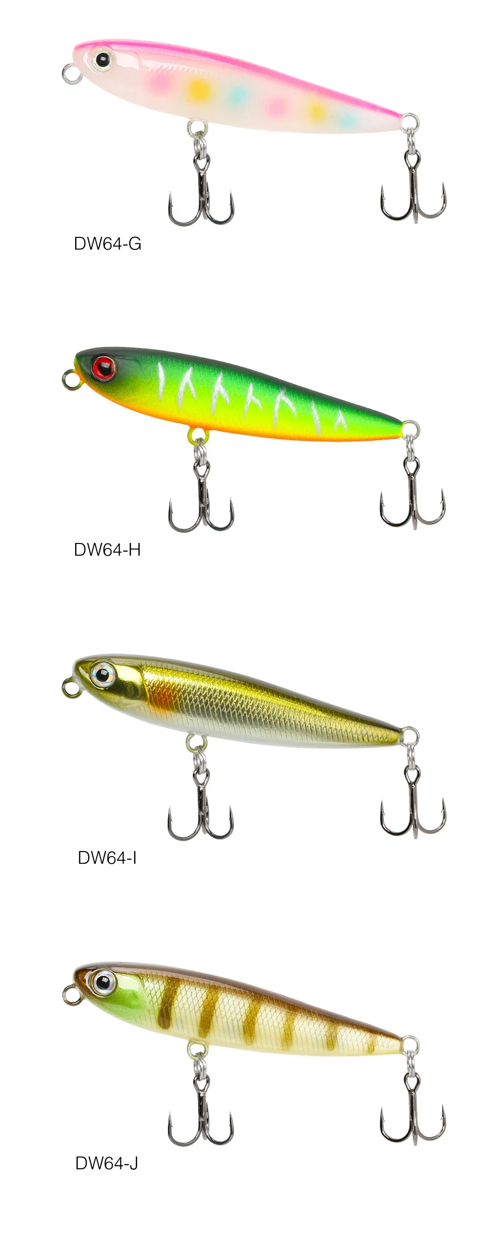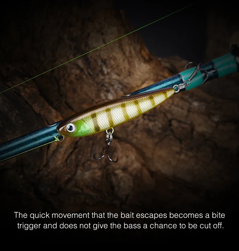 El sistema de transferencia de peso trasero también para una mayor distancia de lanzamiento, una combinación letal de acción y acústica dinámica, el lápiz DW64 permite a cualquier pescador ejecutar sin esfuerzo una acción perfecta para caminar al perro que va acompaña de un sonajero acústico único.Para ayudar a captar la atención de los peces de caza, el lápiz DW64 también viene equipado con distintos ojos rojos que le dan la aparición de un pez cebo lesionado.