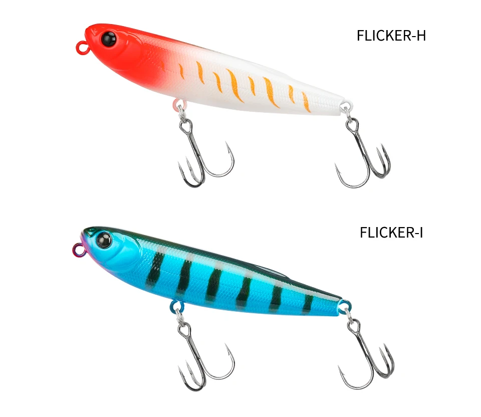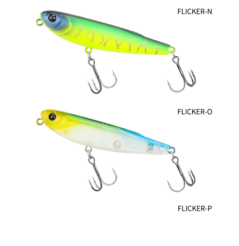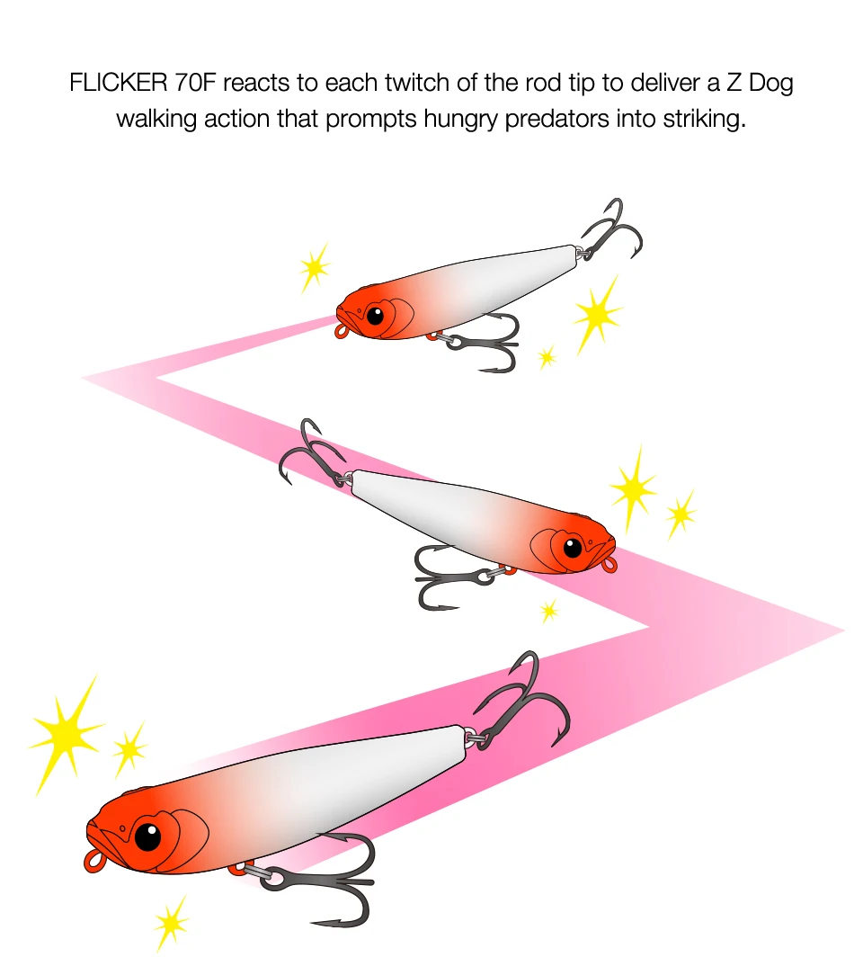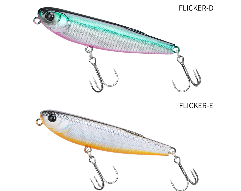 FLICKER, un lápiz de 70 mm, mezcla diapositivas naturales con un ritmo ágil de paseo de perro.Tiene un poder explosivo para juegos de superficie como marabass, dorada y zaman