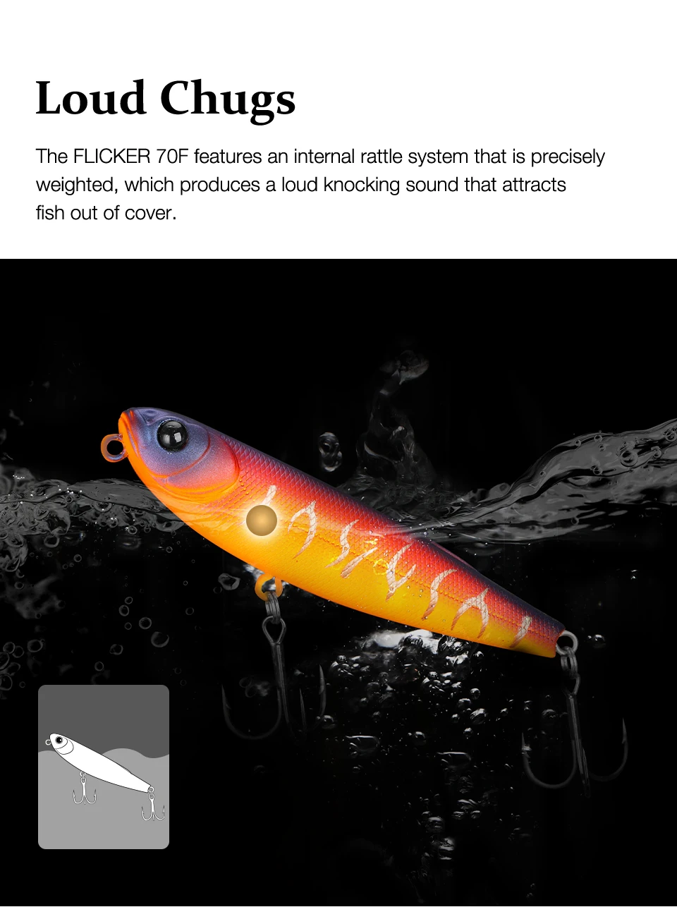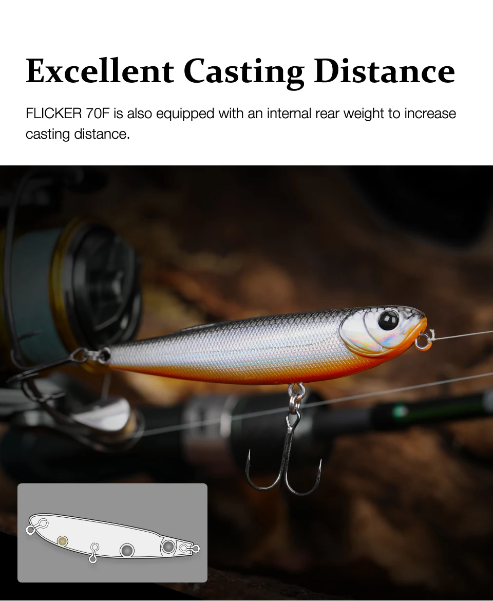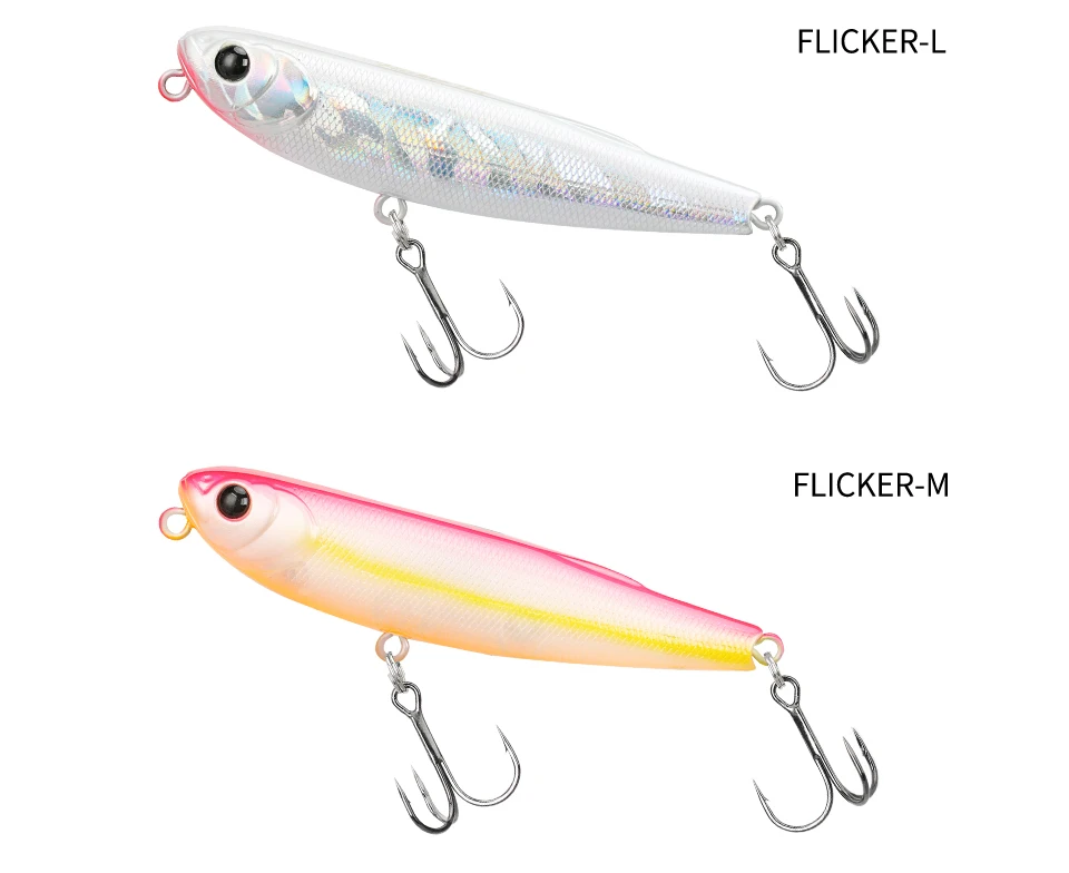 FLICKER, un lápiz de 70 mm, mezcla diapositivas naturales con un ritmo ágil de paseo de perro.Tiene un poder explosivo para juegos de superficie como marabass, dorada y zaman