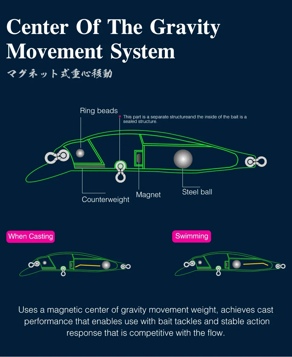 El cuerpo robusto ha sido equipado con un sistema de peso móvil con imán que se desprende para una lanzamiento absoluta para que los pescadores terrestres lancen su señuelo con fuertes vientos de cabeza y vientos laterales.