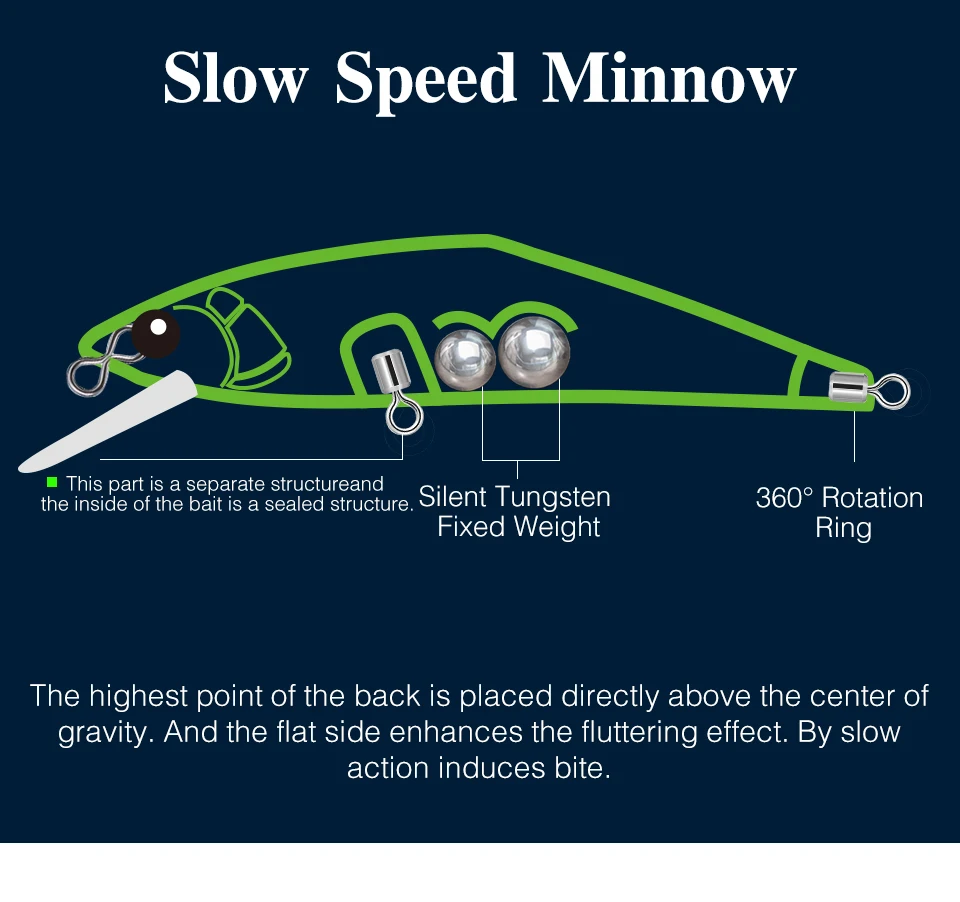 The highest point of the back is placed directly above the center of gravity. And the flat side enhances the fluttering effect. Slow action induces bite from fish.