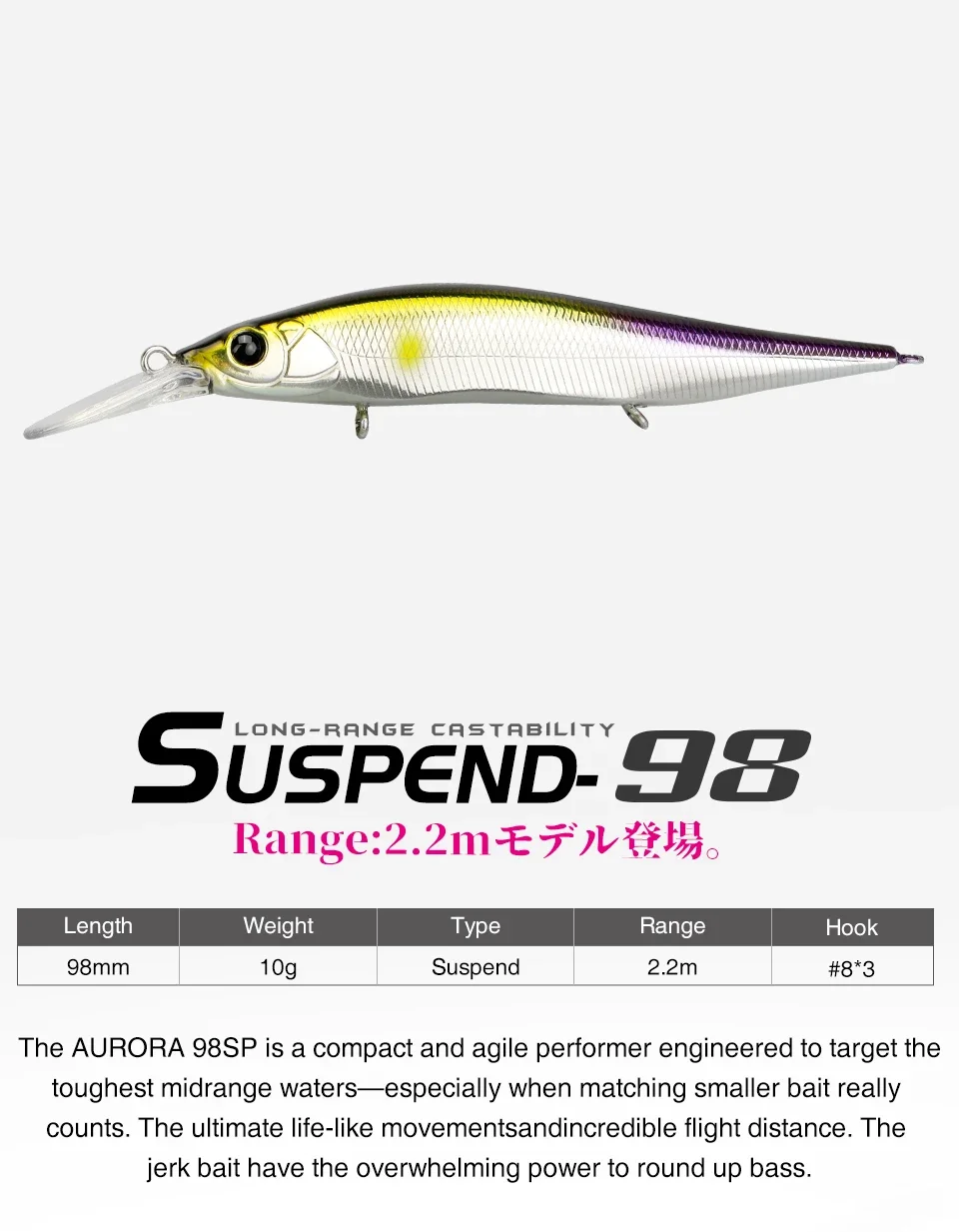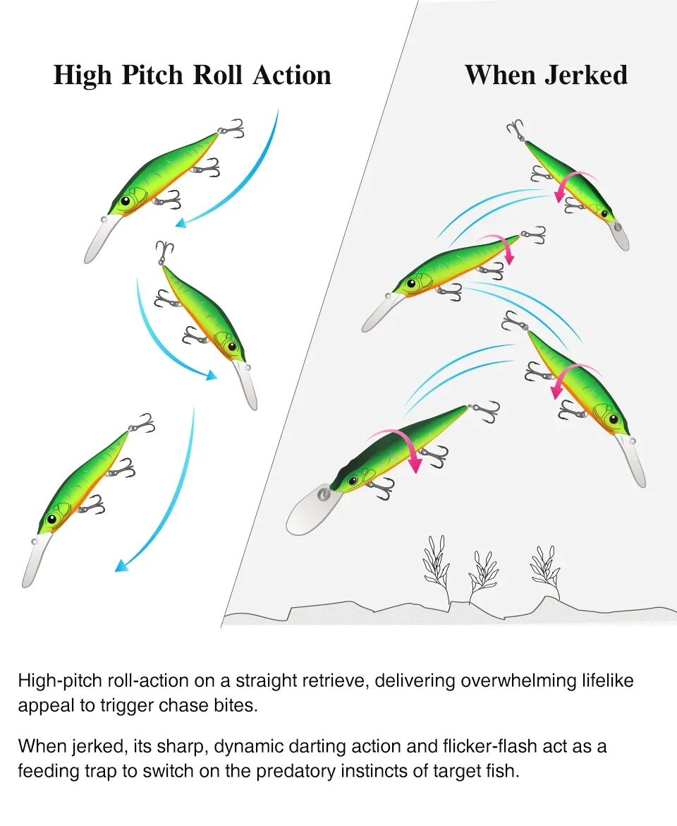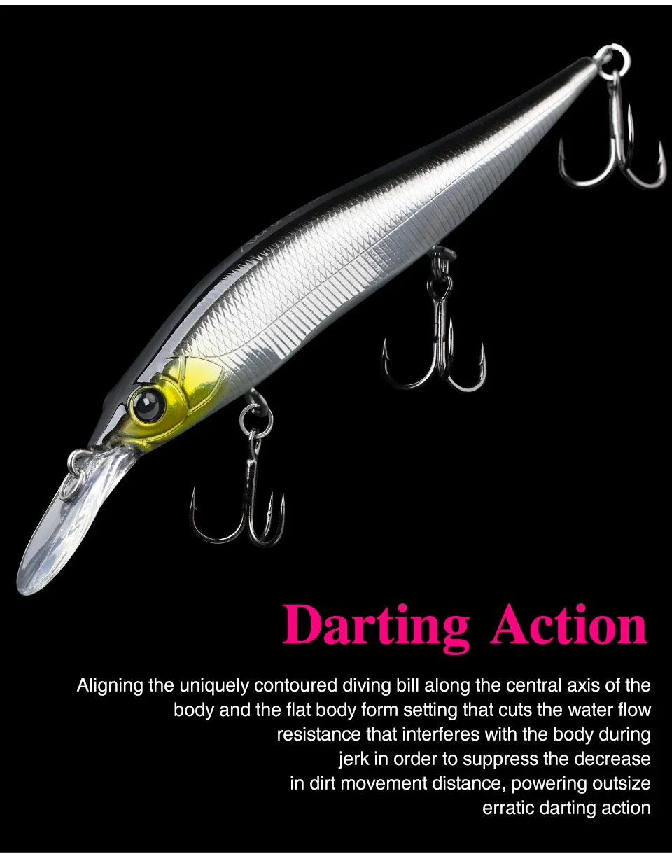 Alinear el labio a lo largo del eje central del cuerpo y el cuerpo plano corta la resistencia al flujo de agua que interfiere con el cuerpo durante el tirón para suprimir la disminución de la distancia de movimiento, el tamaño de salida y la acción de dardo errática.