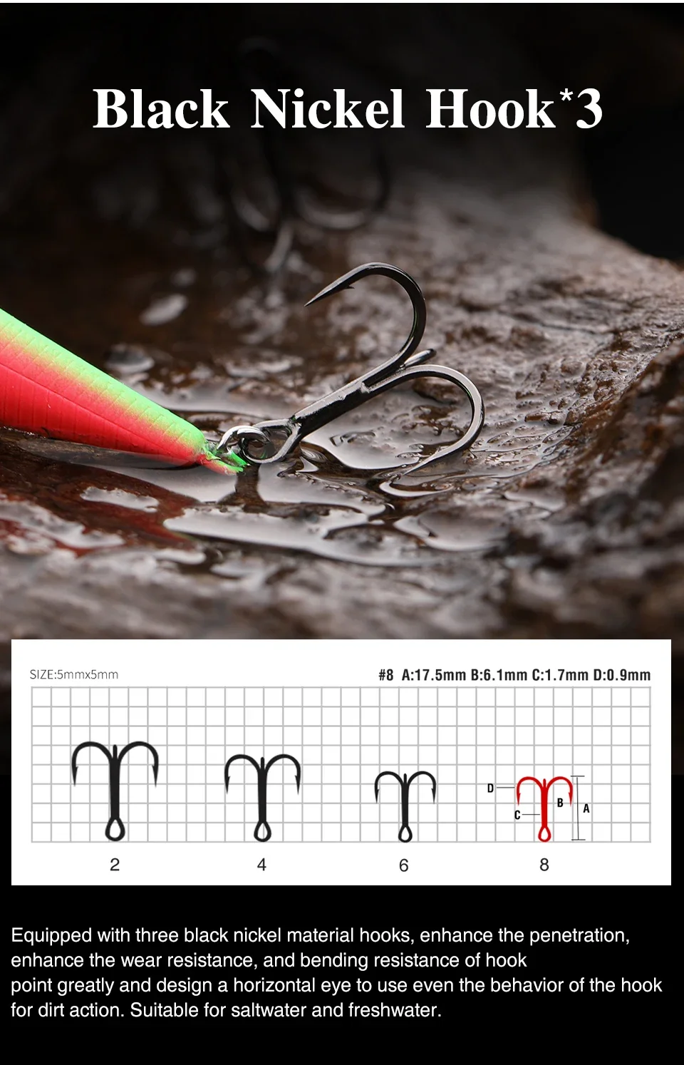 Equipado con tres ganchos de material de níquel negro, mejora enormemente la penetración, la resistencia al desgaste y el punto de resistencia a la flexión y diseña un ojo horizontal para usar. Apto para agua salada y agua dulce.