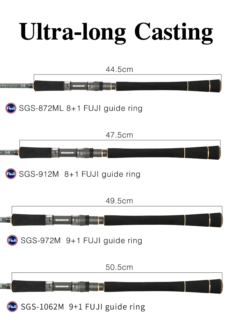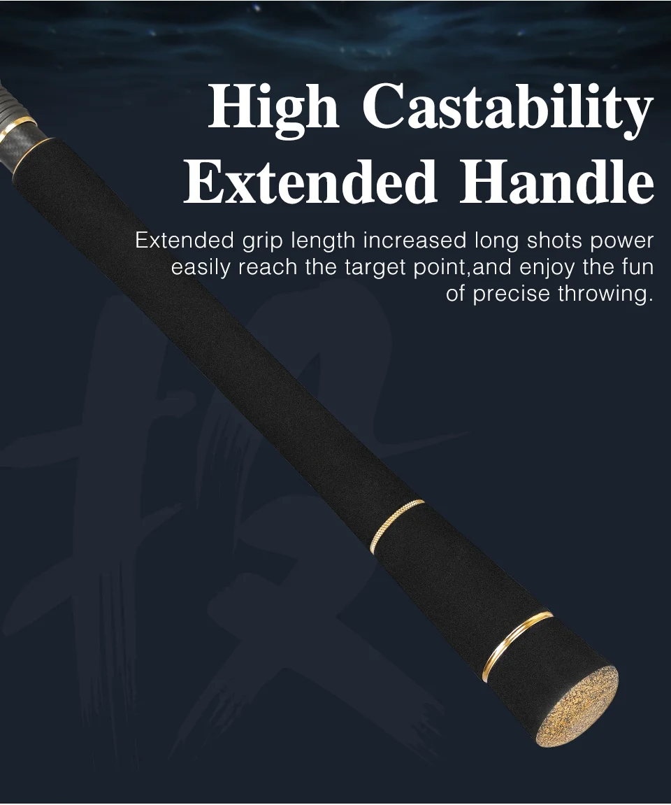 4. Mango de alta capacidad de fundición, la longitud de agarre extendida aumenta la potencia de tiros largos, alcanza fácilmente el punto objetivo, diseño específico para la pesca de lubina
