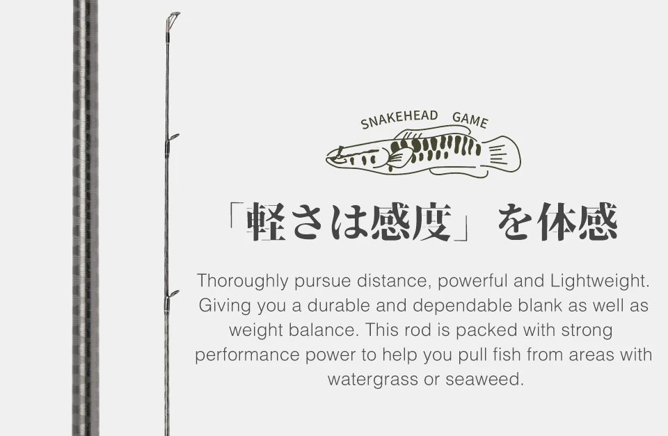 Persigue a fondo la distancia, potente y ligero. Brindándole un espacio en blanco duradero y confiable, así como un equilibrio de peso. Esta caña está repleta de una gran potencia de rendimiento para ayudarte a sacar peces de áreas con hierba acuática o algas marinas.