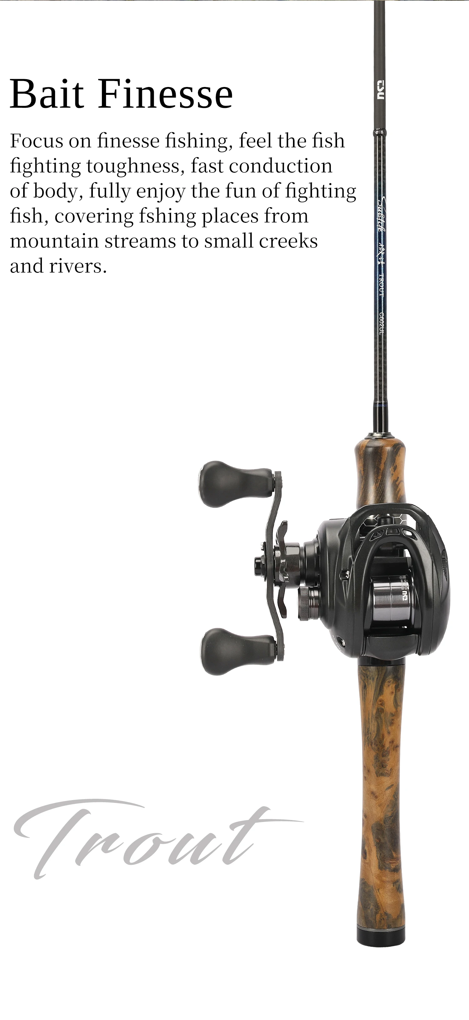 Fantástica caña. Lanza brillantemente y maneja truchas de todos los tamaños. ¡Mucha acción para lanzar señuelos ligeros y minimizar que los peces sacudan el anzuelo!