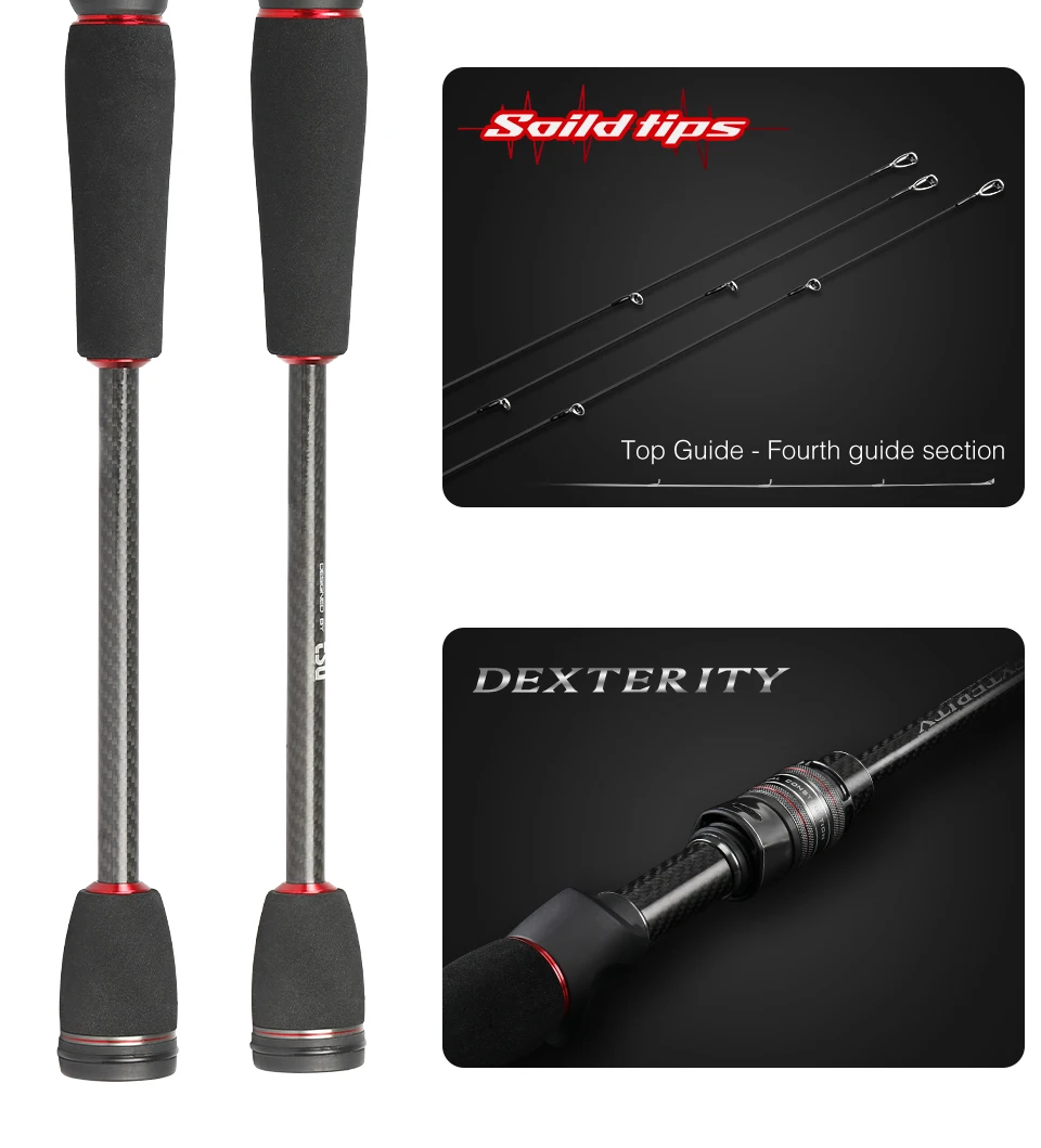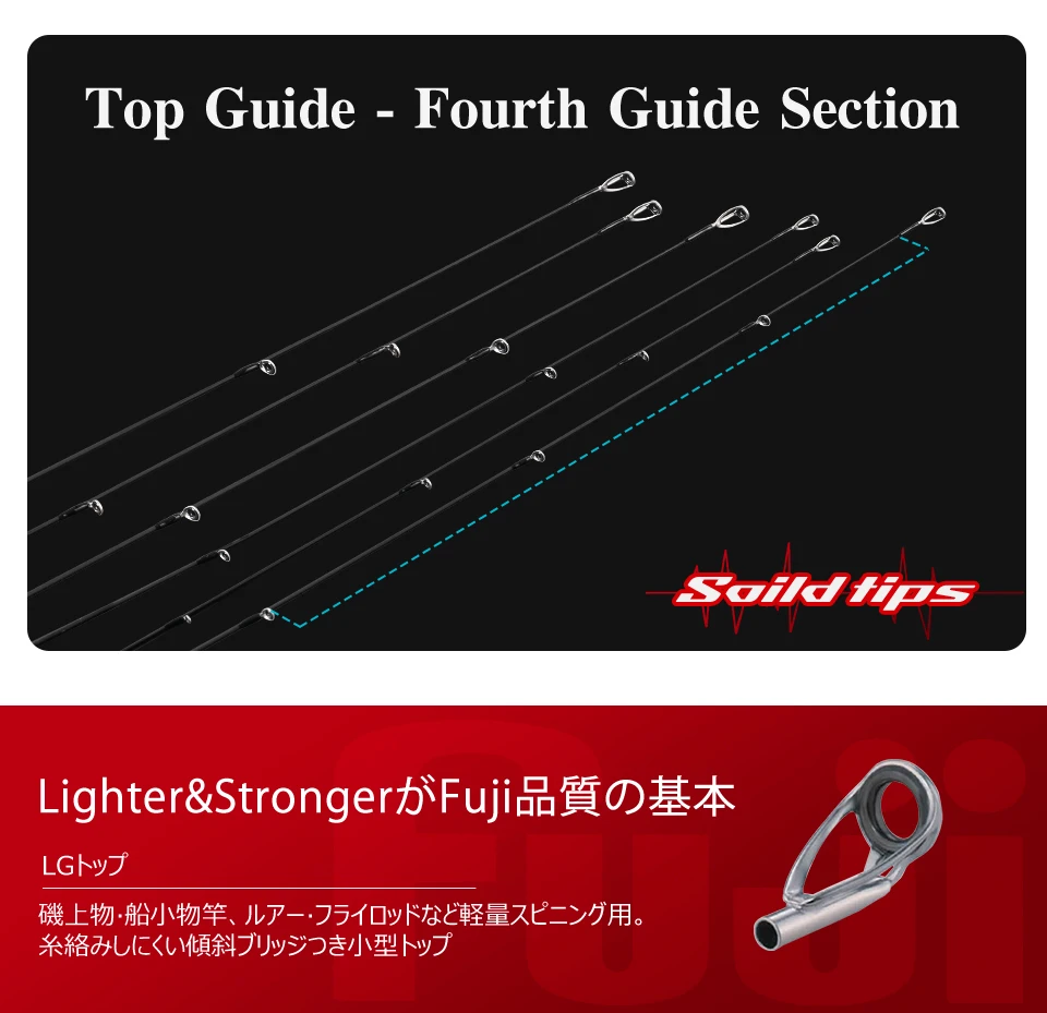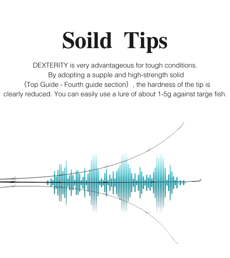 4.LA DEXTERIDAD es muy ventajosa para las condiciones difíciles.Al adoptar un sólido flexible y de alta resistencia (Guía superior - Cuarta sección de guía), la dureza de la punta se reduce claramente.Puede utilizar fácilmente un señuelo de aproximadamente 1 a 5 g contra peces dilatados.