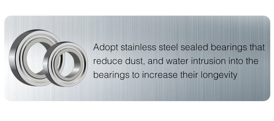 Adopta rodamientos sellados de acero inoxidable que reducen el polvo y la intrusión de agua en los rodamientos para aumentar su longevidad