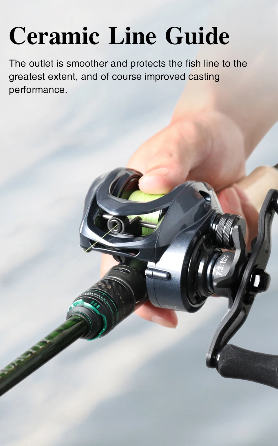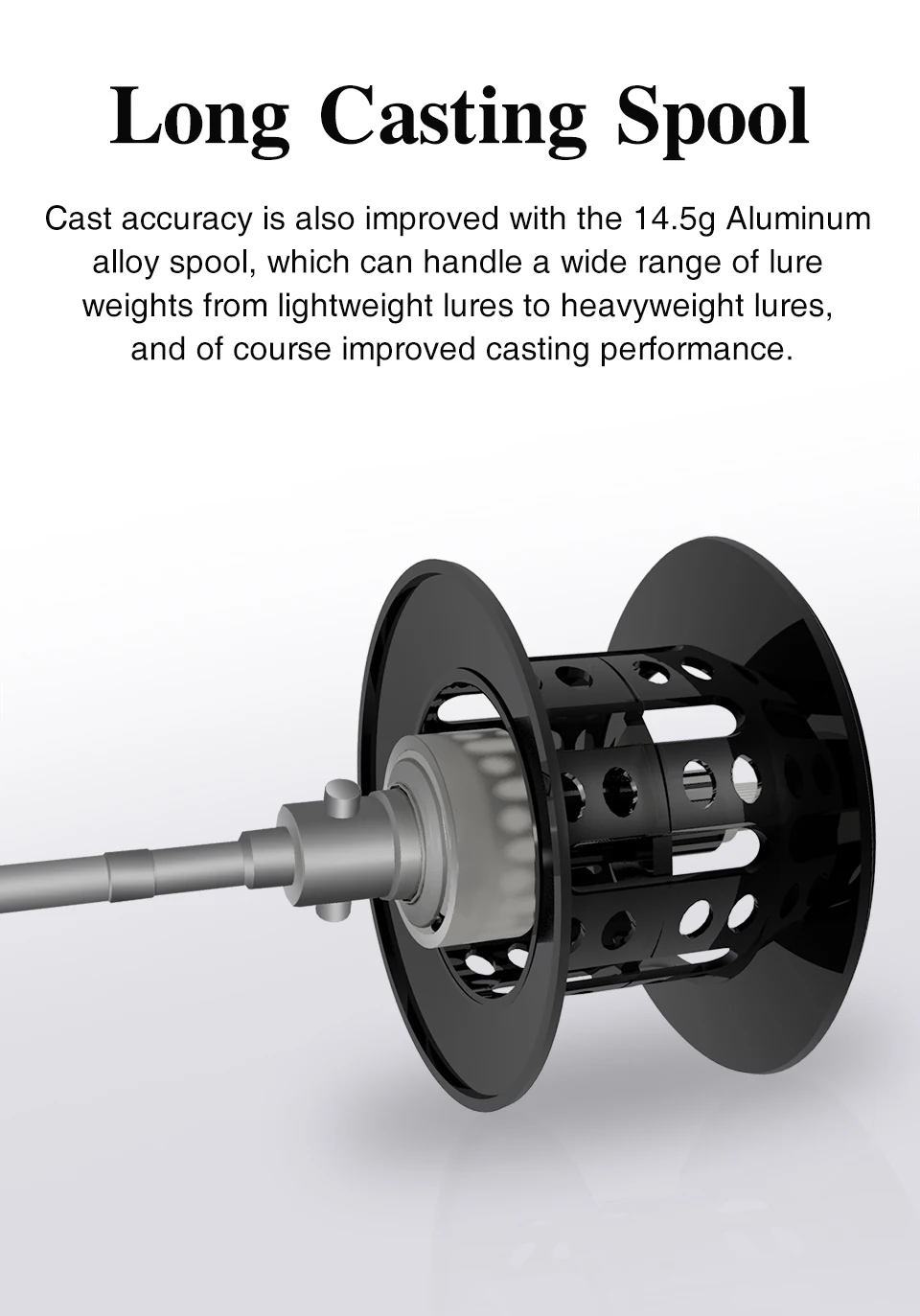 La precisión del lanzamiento también se mejora con el carrete de aleación de aluminio de 14,5g, que puede manejar una amplia gama de pesos de señuelos, desde señuelos ligeros hasta señuelos pesados y, por supuesto, un rendimiento de fundición mejorado.
