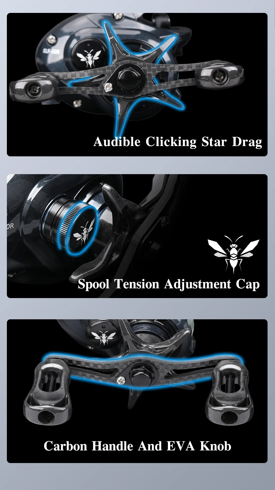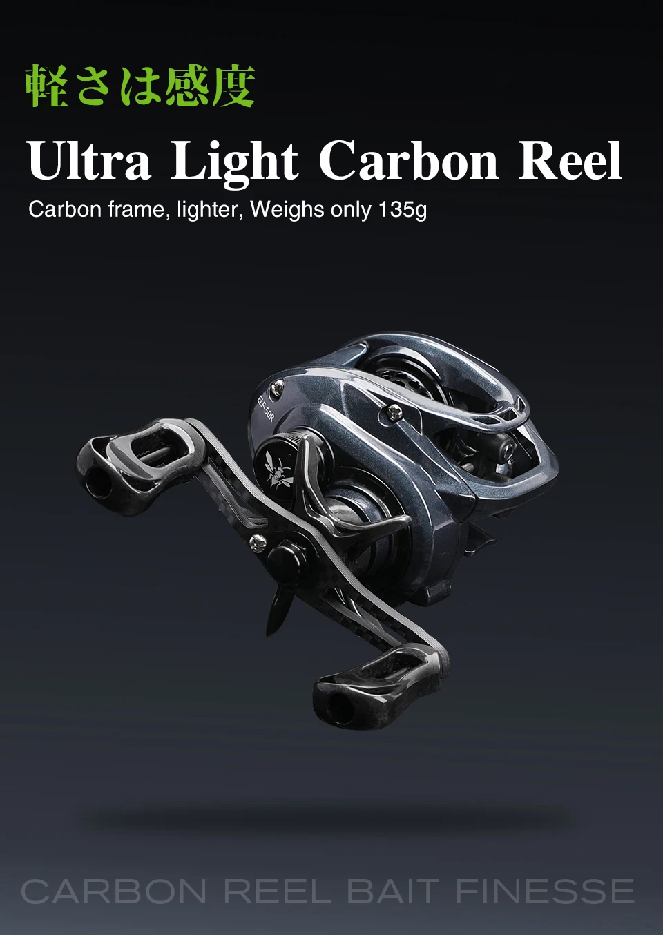 Estructura y placa lateral de carbono súper resistentes, diseño ultraligero, el carrete pesa solo 135 g