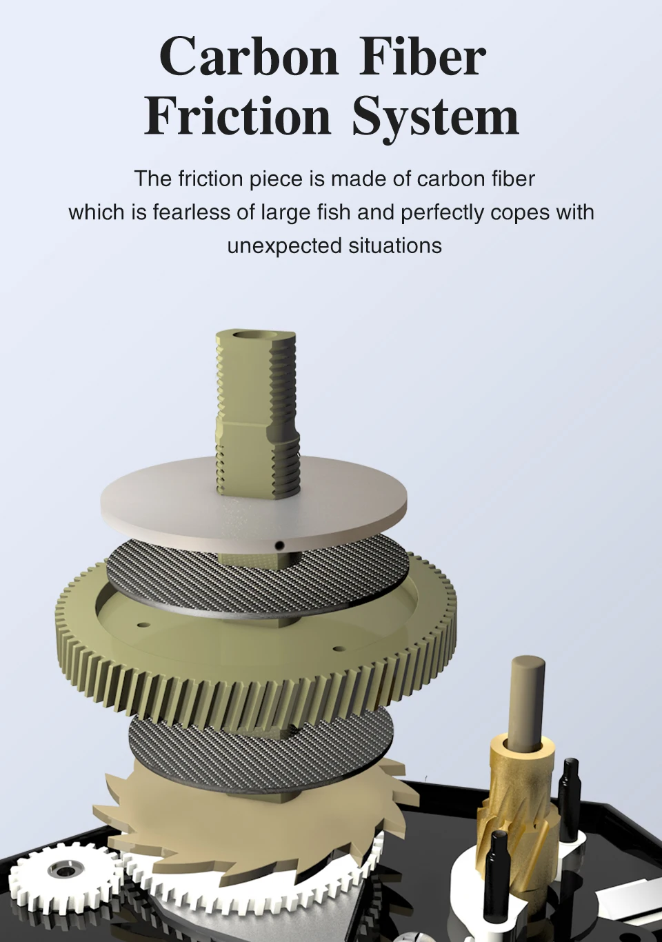 La pieza de fricción está hecha de fibra de carbono, que no teme a los peces grandes y se adapta perfectamente a situaciones inesperadas.